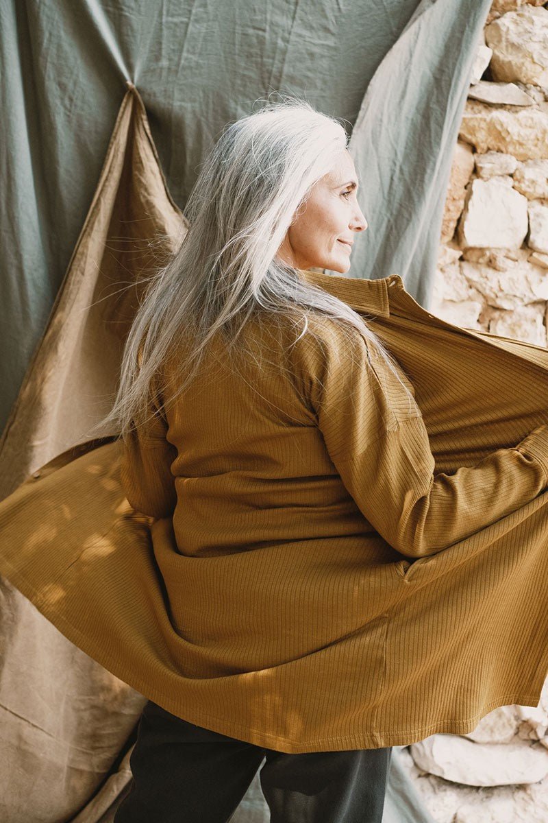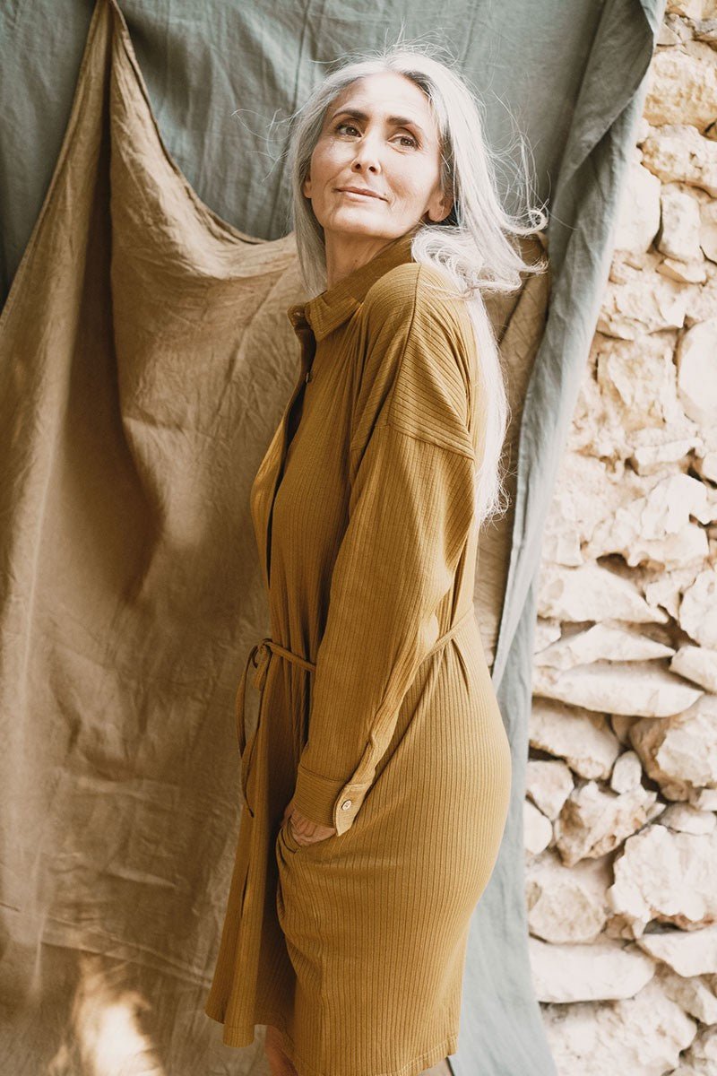 Janire is an oversized short knitted shirt dress with long sleeves. It has an additional belt that allows you to tie it at your waist and wear it as you like. A comfortable and versatile model suitable for different looks. You can combine it with the Juliet trousers and the Jade T-shirt or wear it as a dress. A timeless basic for your sustainable wardrobe. The earth-inspired jade green/mustard colour conveys harmony and balance. The fabric is very soft and pleasant to the skin. Moreover, it is made without toxins and is hypoallergenic.