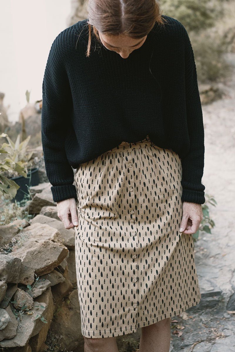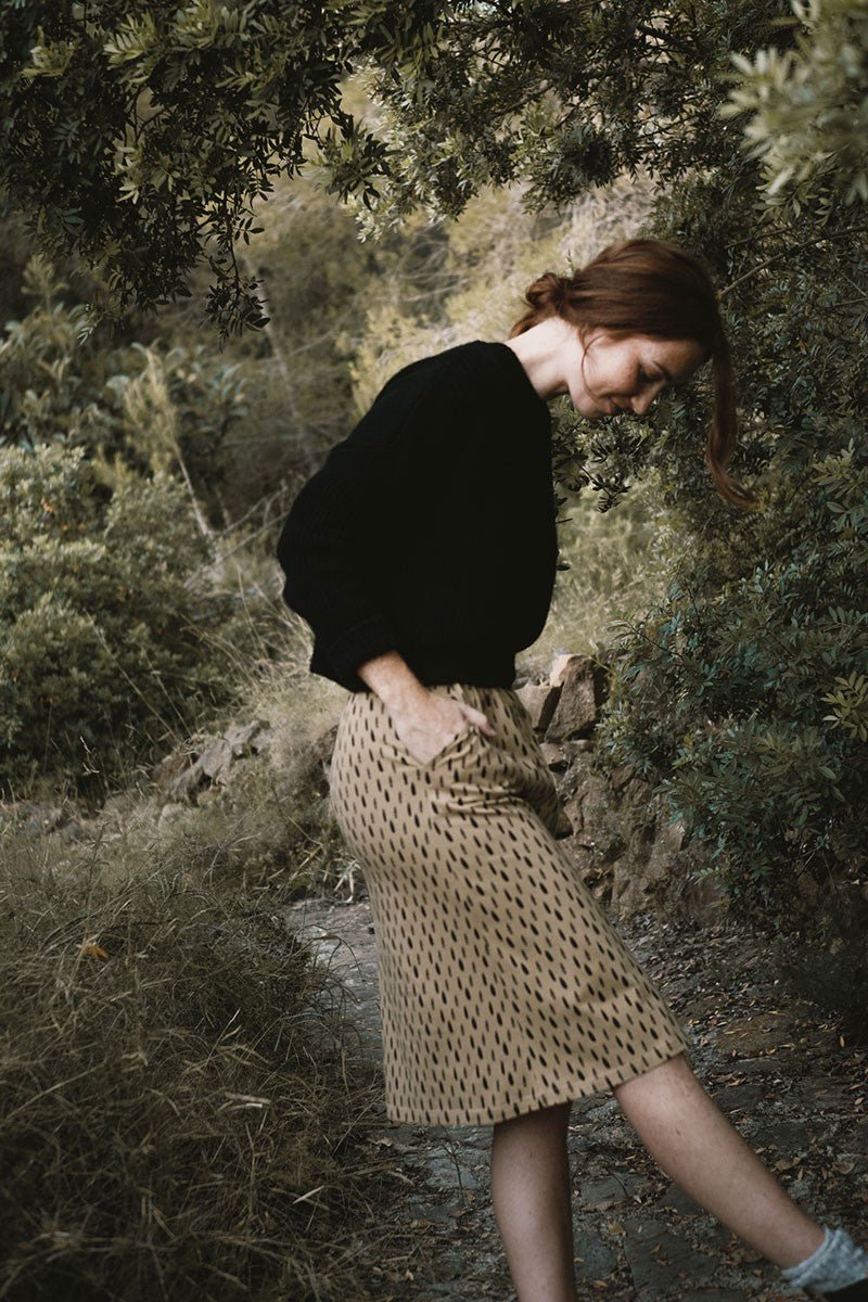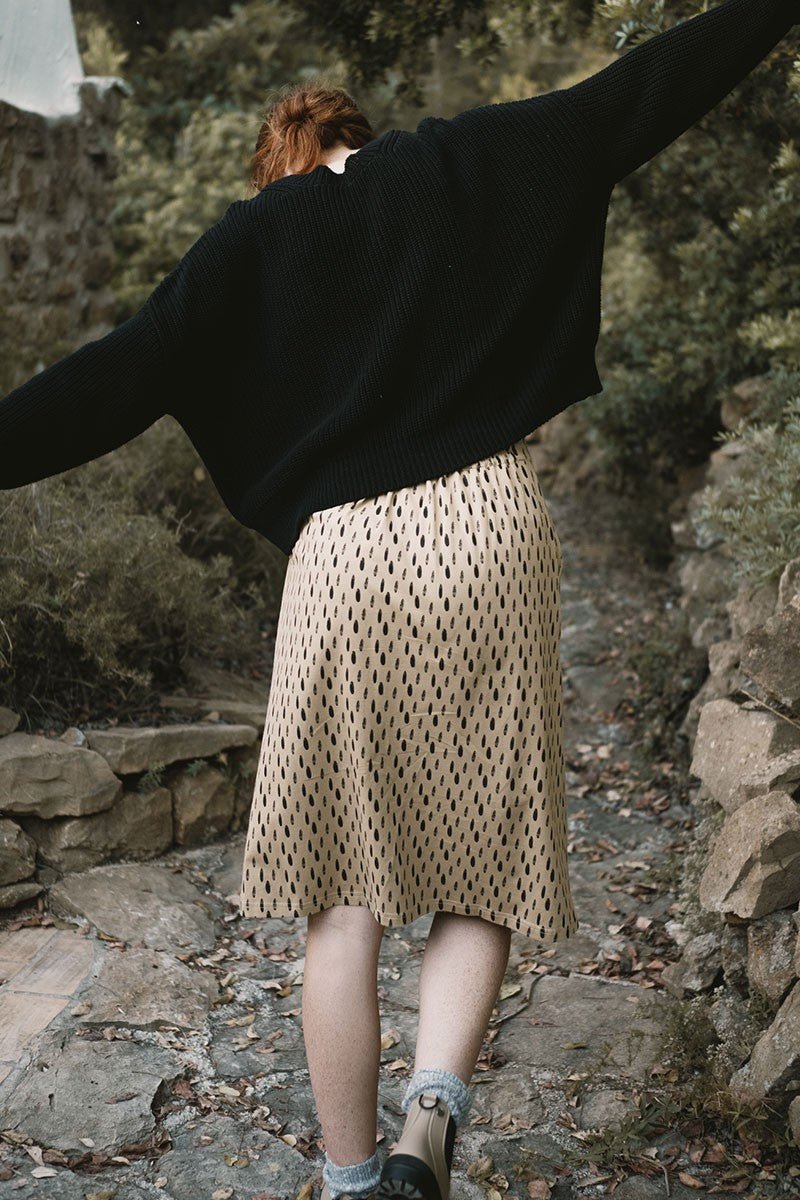 Jara is a knitted midi skirt with side pockets and a slit with functional lined buttons. With elastic at the back to better adapt to your waist. A comfortable and versatile garment that you can wear from spring to autumn. Perfect combined with the Jakie tricot jumper for a complete look. The river stones print in beige from the Earth collection, inspired by mother earth, gives a unique and special touch to the garment. This garment has a very soft and pleasant touch on the skin. In addition, it is made free of chemicals and is hypoallergenic. Sarah is 1.81cm tall and wears size S.
