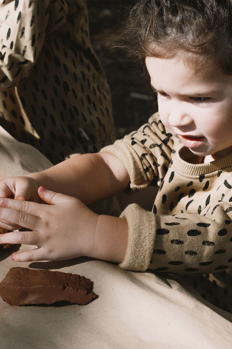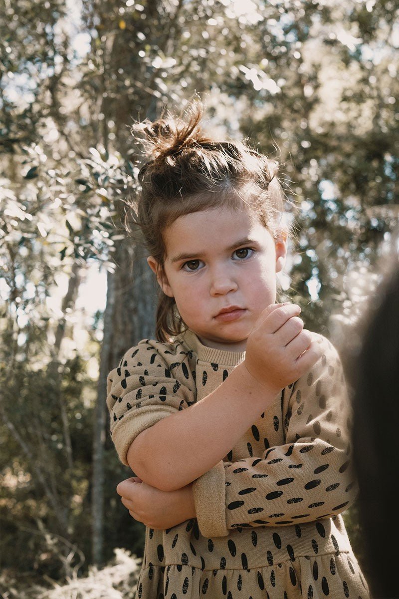 Jess is a terry dress with long raglan sleeves. It is an oversized model fitted at the waist and with side pockets. Perfect for the coldest days of the year. The river stones print in beige, from the Earth collection, inspired by mother earth, gives the garment that unique and special touch. All our garments are made free of toxins and are hypoallergenic for your little one’s soft and delicate skin.