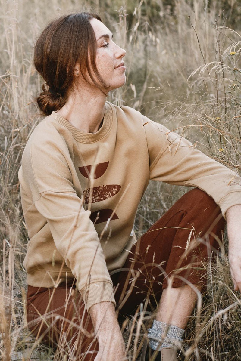 Joana is a comfy organic cotton sweatshirt with long sleeves and an oversized silhouette. It has dropped shoulders and a round neckline with ribbed trim. A very comfortable and warm garment for cold days. Brand new this season! It features a front drawing made with eco-friendly pigments. The clay forms print in beige from the Earth collection, inspired by the earth, gives it that unique and special touch. This garment has a very soft and pleasant feel on the skin. It is hypoallergenic and free of chemicals. Sarah is 1.81cm tall and wears size SM.