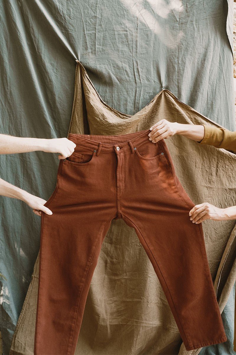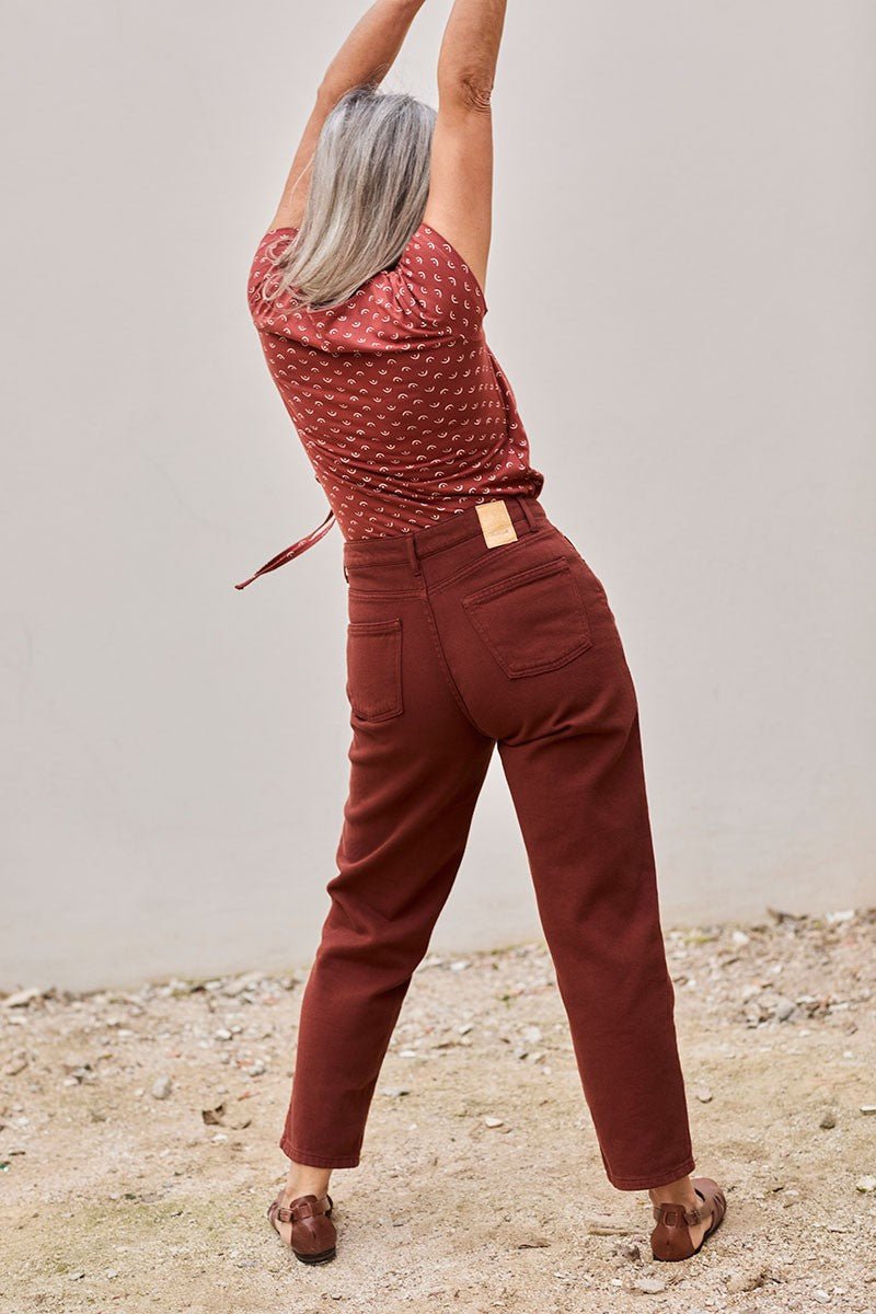 Juliet is a pair of cotton twill trousers. It has a straight cut and a high waist with pockets on the sides and back. Brand new this season! These sustainable jeans are completely versatile. The straight momfit silhouette is timeless and flattering. The earth-inspired agate garnet colour conveys vitality and confidence. These limited edition trousers are made with local cotton and manufactured locally, extremely close to home. Moreover, they are made using renewable energy from nut shells and low-impact, water-saving finishing methods. Km 0 production made in Spain. Sarah is 1.81 cm tall and wears size 40, Raquel is 1.68 cm tall and wears size 38.