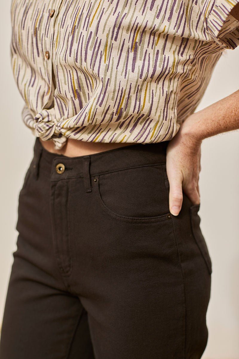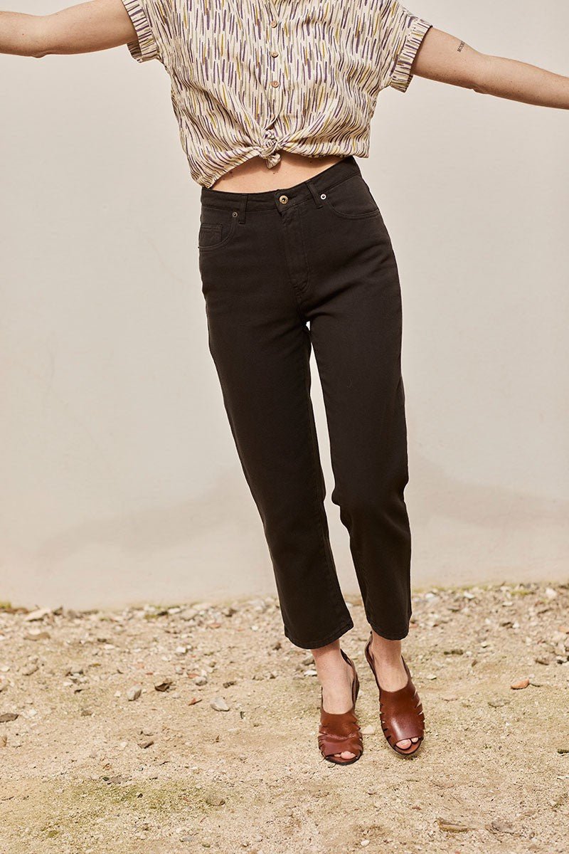 Juliet is a pair of cotton twill trousers. It has a straight cut and a high waist with pockets on the sides and back. Brand new this season! These sustainable jeans are completely versatile. The straight momfit silhouette is timeless and flattering. The onyx black colour of earthy inspiration conveys strength and elegance. These limited edition trousers are made with local cotton and manufactured locally, extremely close to home. Moreover, they are made using renewable energy from nut shells and low-impact, water-saving finishing methods. Km 0 production made in Spain. Sarah is 1.81 cm tall and wears size 40, Raquel is 1.68 cm tall and wears size 38.
