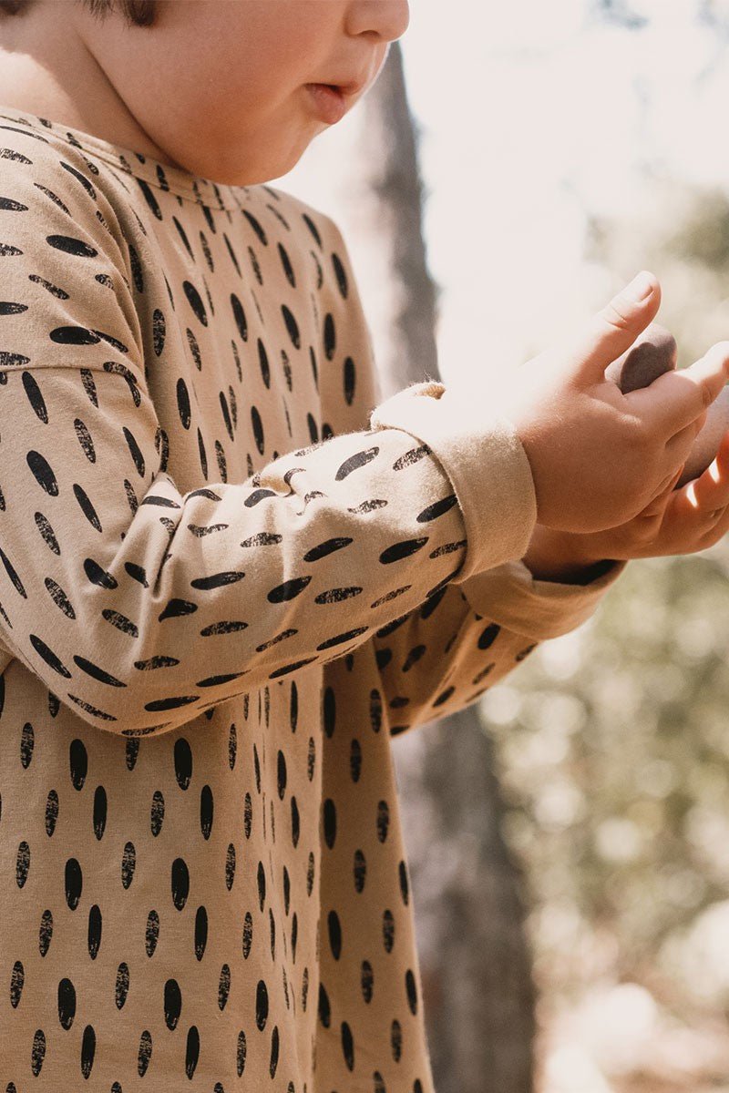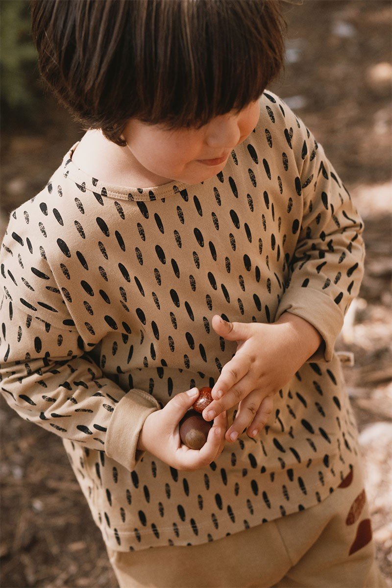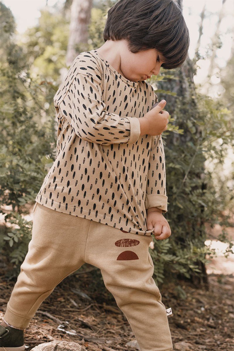 Jun is an oversized knitted T-shirt with long sleeves. The loose-fitting design allows your little one to wear it for a longer period of time. The stones’ print in beige, from the Earth collection, inspired by Mother Earth, gives the garment that unique and special touch. Combine it with the Jabari pants for a perfect look. All our garments are made free of toxins and are hypoallergenic for your little one’s soft and delicate skin.