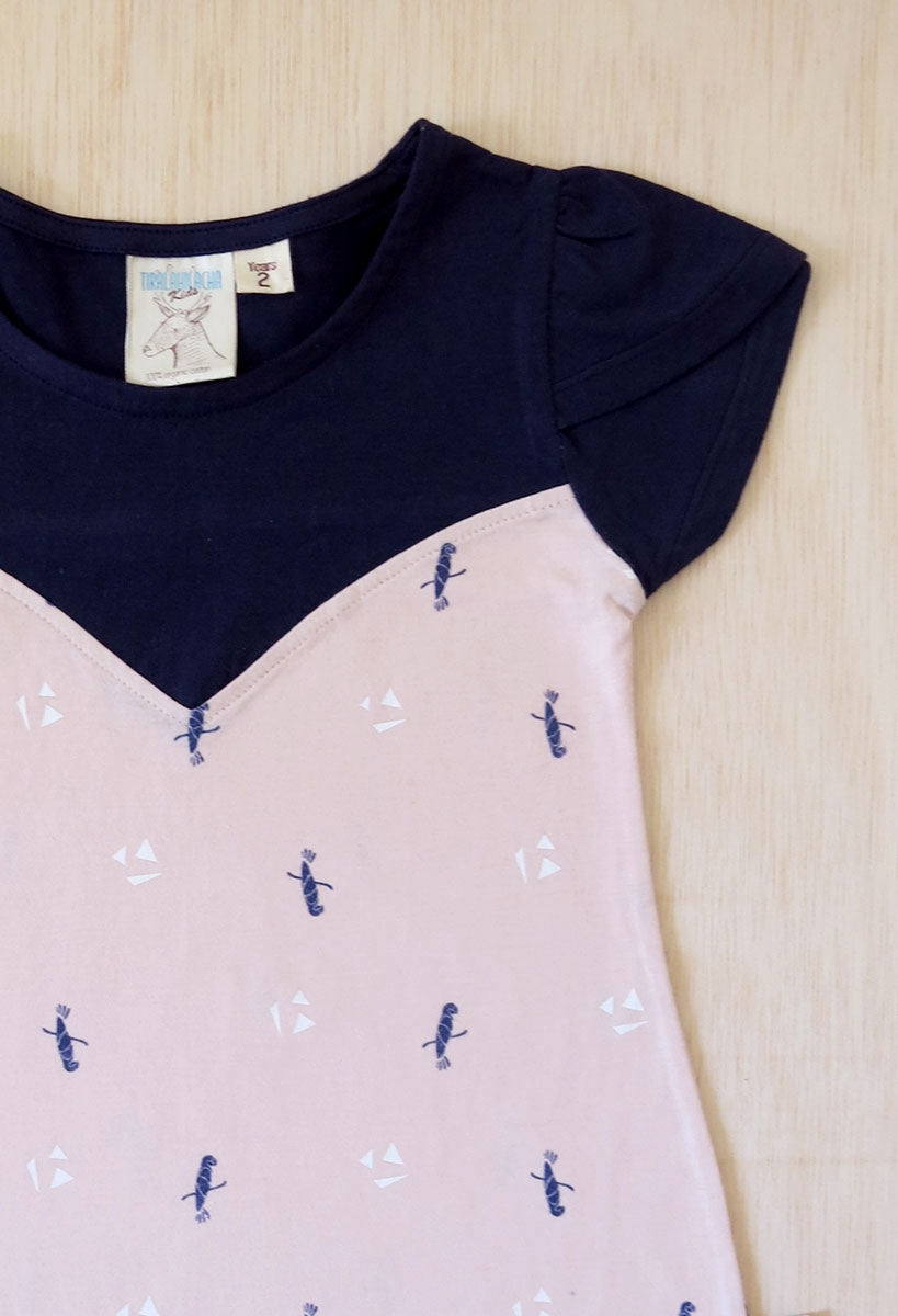 Light pink flared dress with parrots and triangles print. 100% Fair Trade organic cotton.