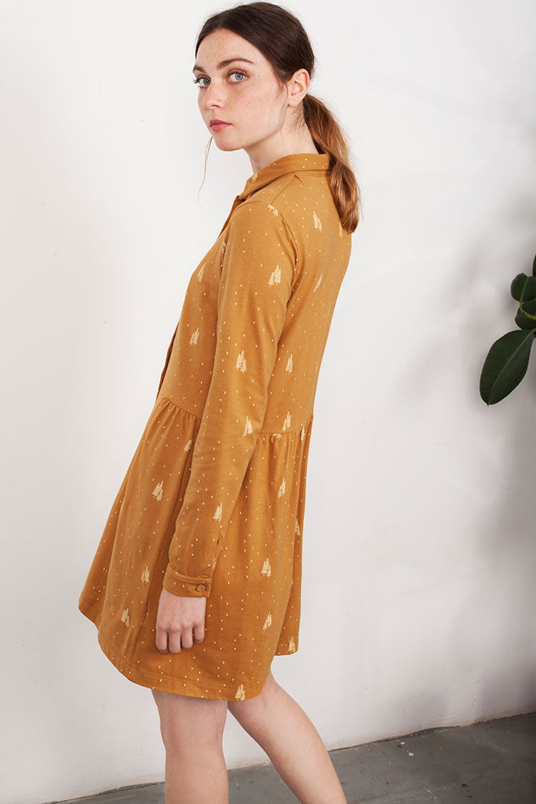 Shirt dress in mustard with trees print. 95% Fair Trade Organic Cotton 5% Lycra.