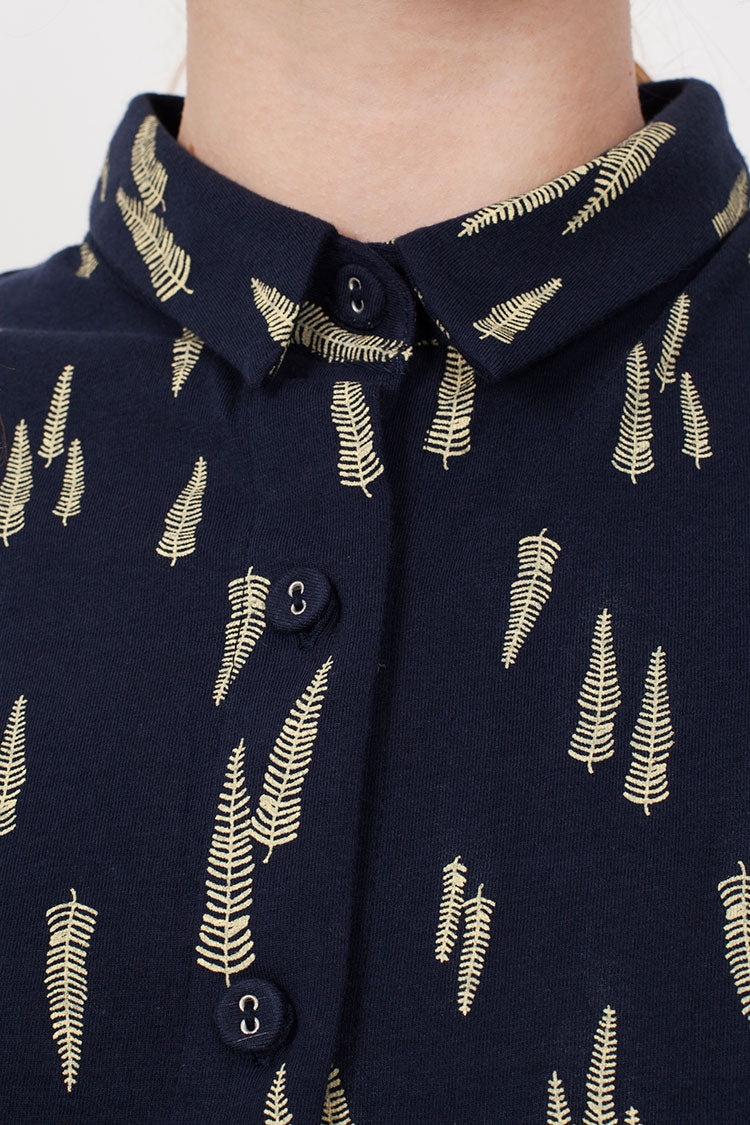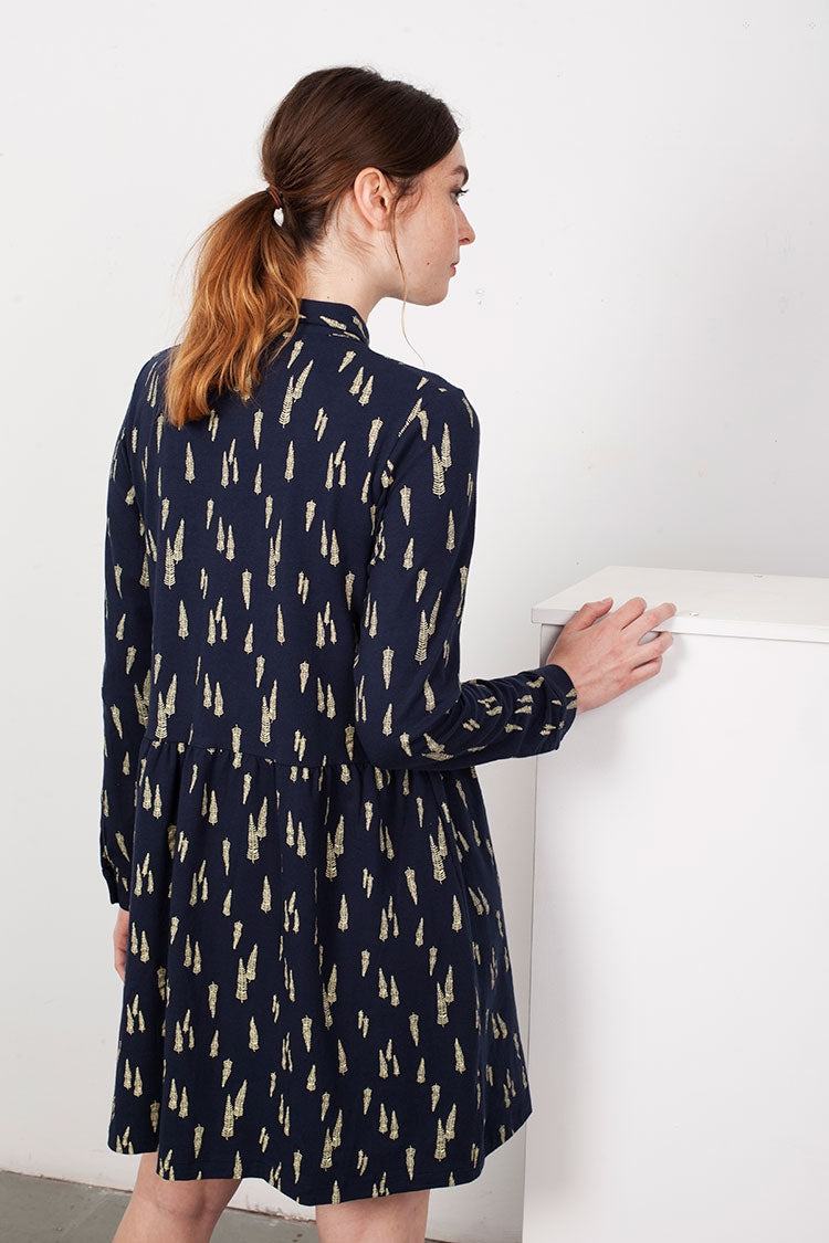 Shirt dress in navi blue with sleaves print. 95% Fair Trade Organic Cotton 5% Lycra.