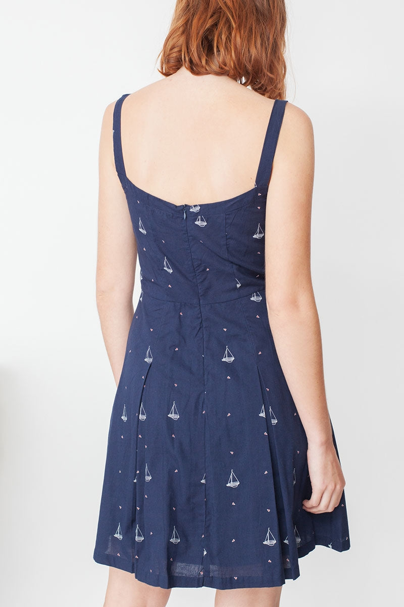 Poplin dress with covered buttons and a very soft lining all over the dress and invisible zip on the back. Boat print in navy blue..100% Fair Trade certified Organic Cotton…