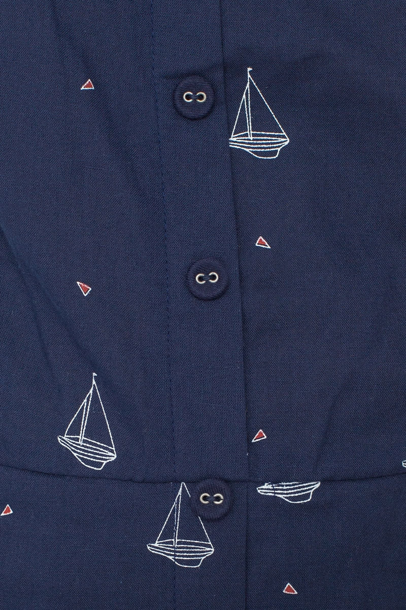 Poplin dress with covered buttons and a very soft lining all over the dress and invisible zip on the back. Boat print in navy blue..