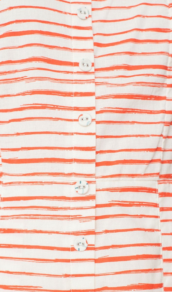 Poplin dress with covered buttons and a very soft lining all over the dress and invisible zip on the back. Reds stripes print.