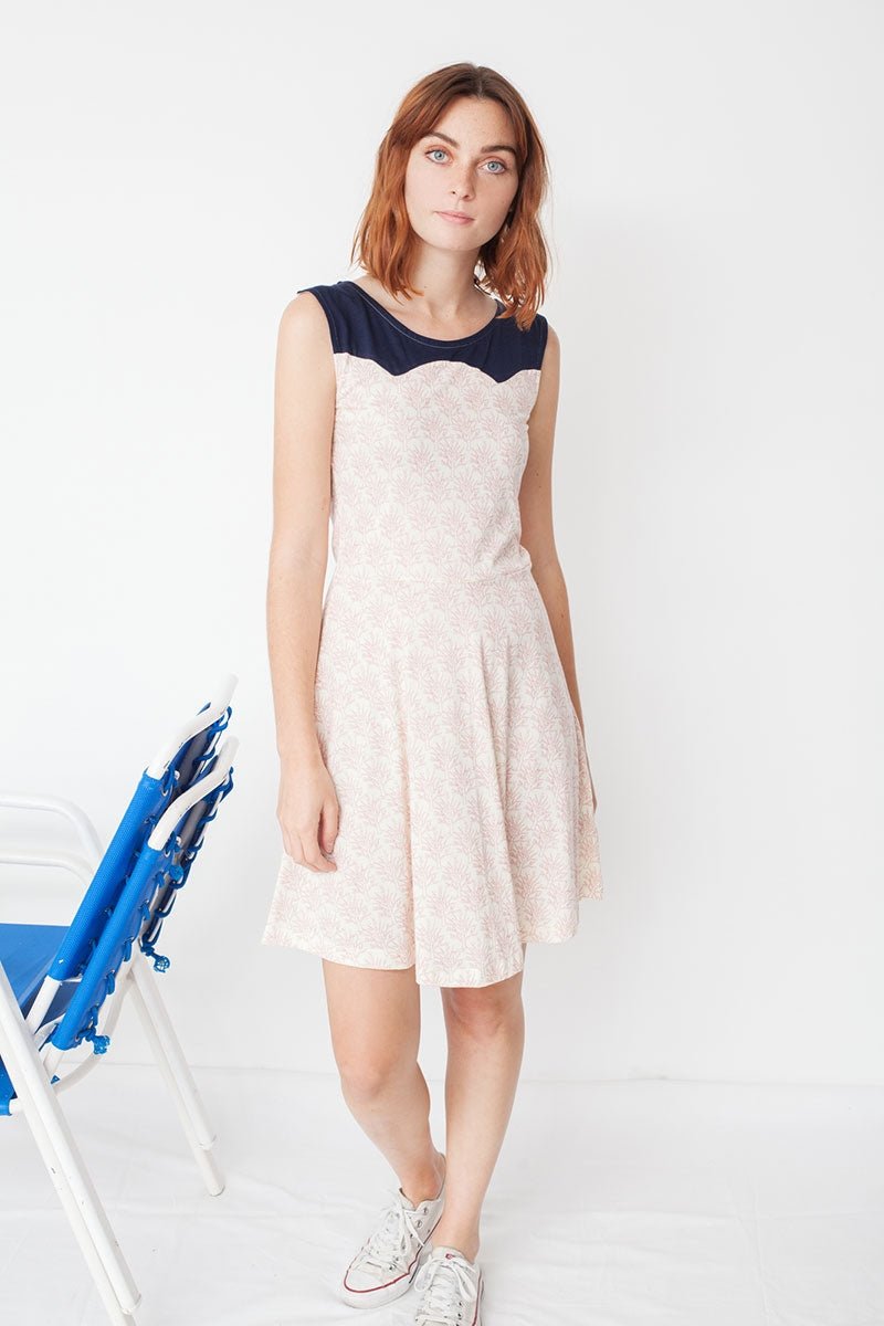 Yoke dress combined with navy blue and coral print.100% Fair Trade certified Organic Cotton Designed with ♥ in Barcelona & ethically made in India.