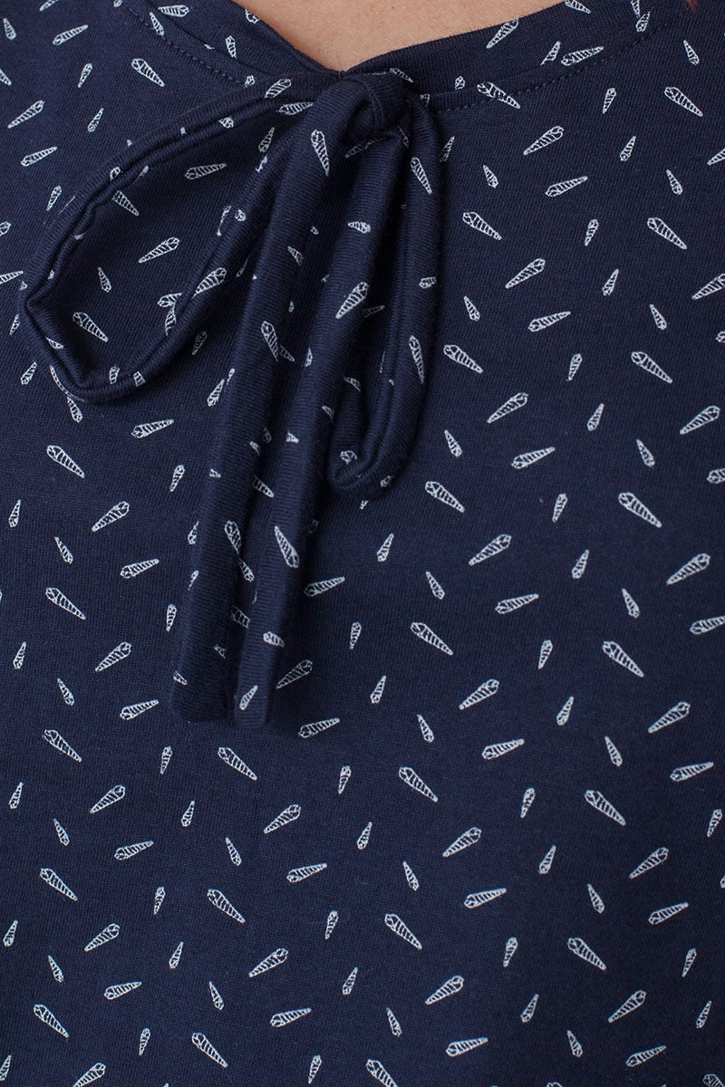 Short sleeve t-shirt with a bow detail on the necklline. Seachells print in navy blue.