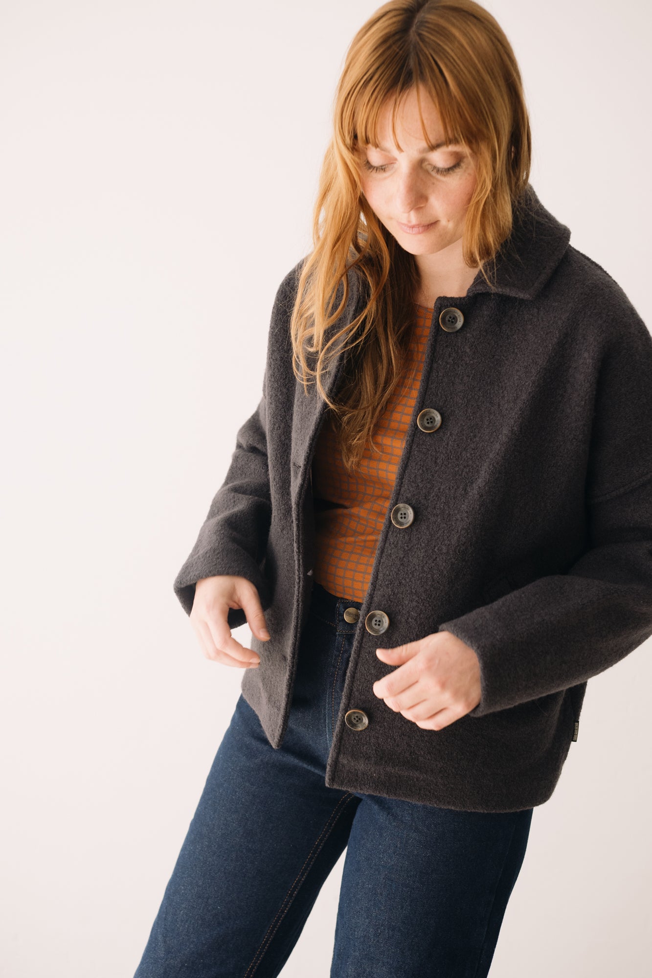 This Jacket is perfect for those who seek warmth, design, and sustainability all in one piece. Thoughtfully created to accompany you for many years, it features a retro-inspired cut with a shirt collar, dropped shoulders, and diagonal pockets. A timeless staple that will become a must-have in your sustainable wardrobe. Crafted from Woolmark- and RWS-certified merino wool knit, ensuring animal welfare and an ethical, environmentally respectful production. The fabric has structure yet feels incredibly lightweight and warm—perfect for chilly days. Finished with biodegradable corozo buttons and lovingly made in our atelier in Tàrrega, Spain. The Bark Grey shade is an essential neutral, a timeless basic that conveys seriousness and stability. A durable color that makes us feel elegantly minimalist.