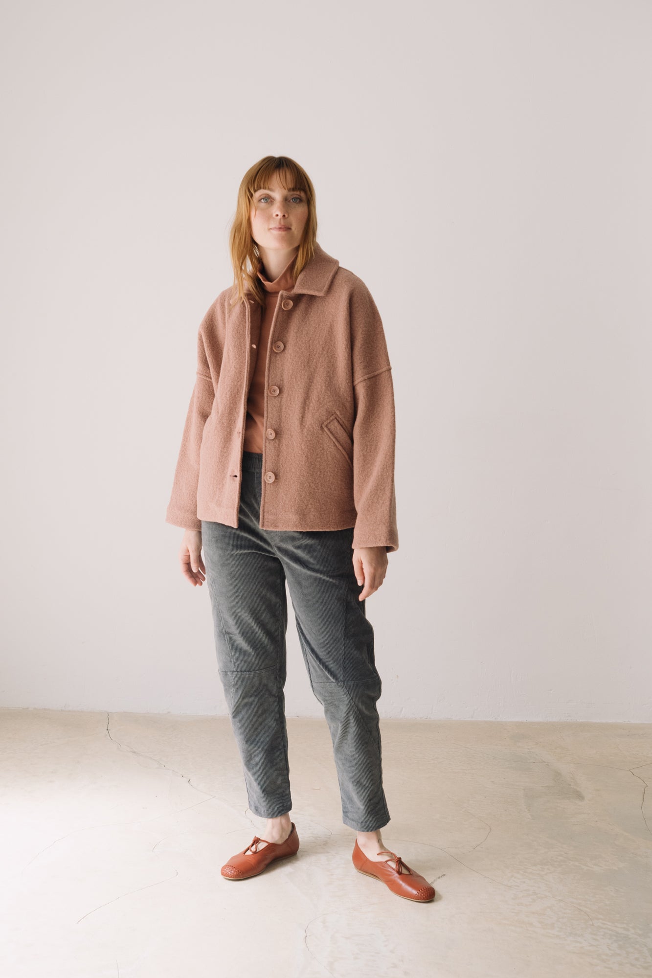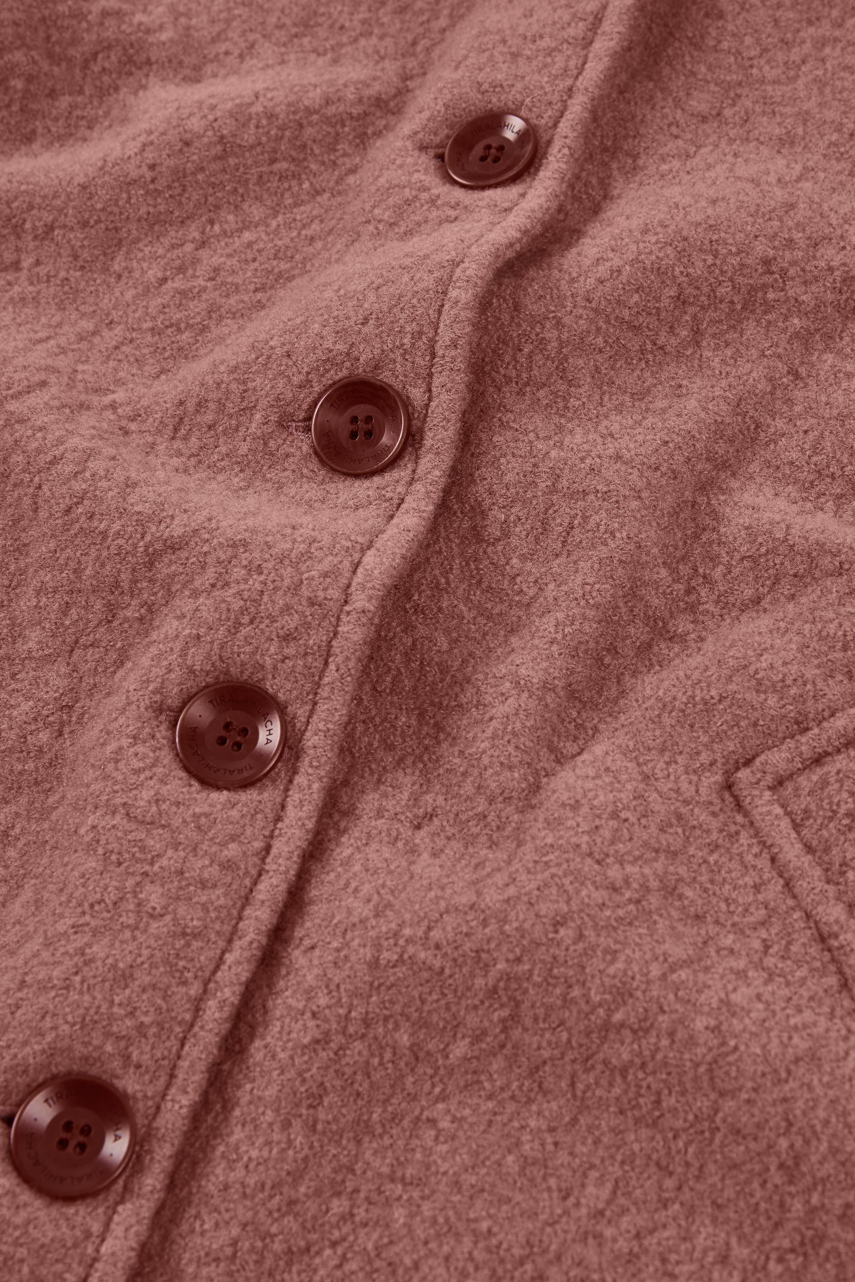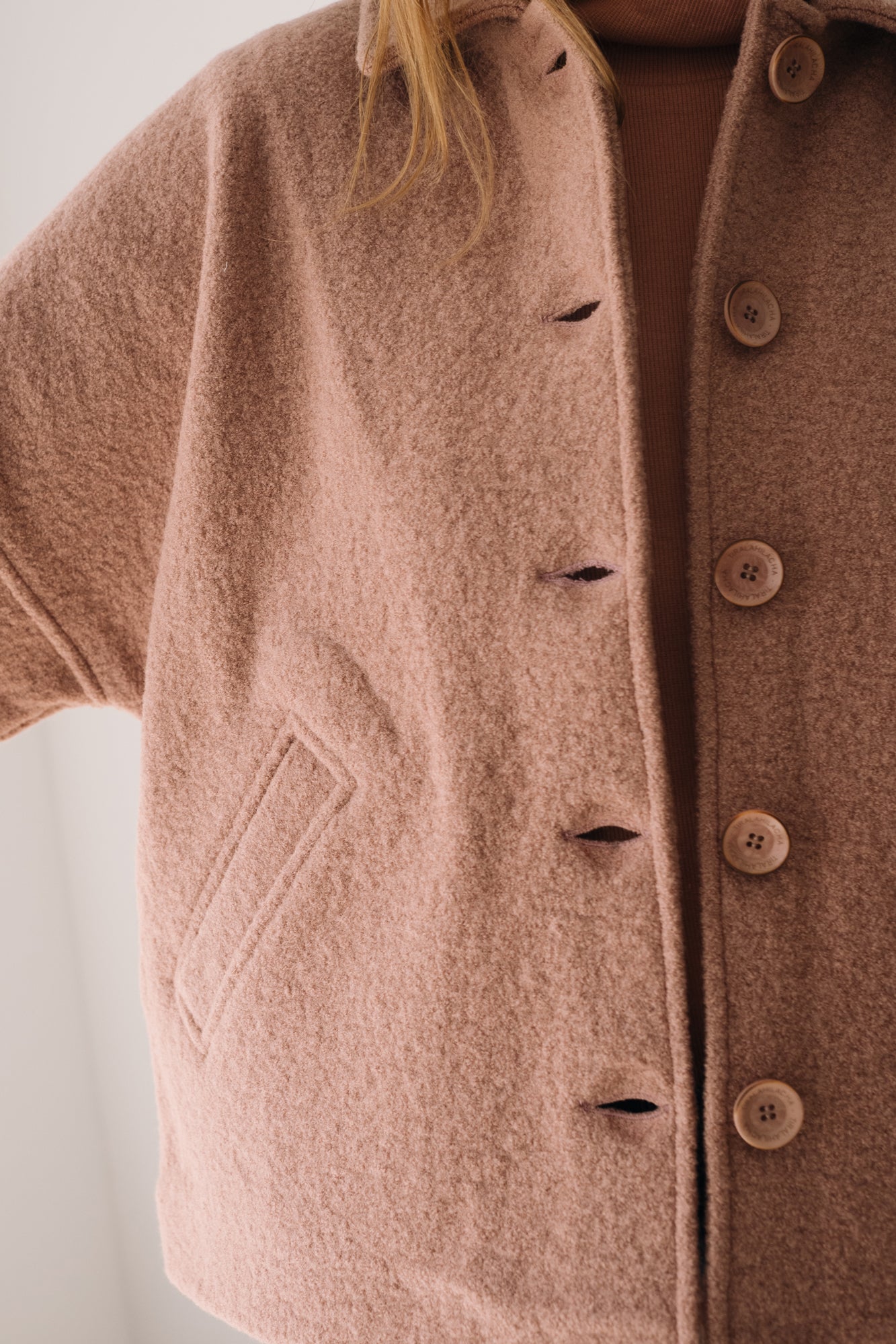 This Jacket is perfect for those who seek warmth, design, and sustainability all in one piece. Thoughtfully created to accompany you for many years, it features a retro-inspired cut with a shirt collar, dropped shoulders, and diagonal pockets. A timeless staple that will become a must-have in your sustainable wardrobe. Crafted from Woolmark- and RWS-certified merino wool knit, ensuring animal welfare and an ethical, environmentally respectful production. The fabric has structure yet feels incredibly lightweight and warm—perfect for chilly days. Finished with biodegradable corozo buttons and lovingly made in our atelier in Tàrrega, Spain. The dusty pink shade evokes sweetness, calm, and delicacy. This soft and timeless shade adds a romantic and serene touch to any look.