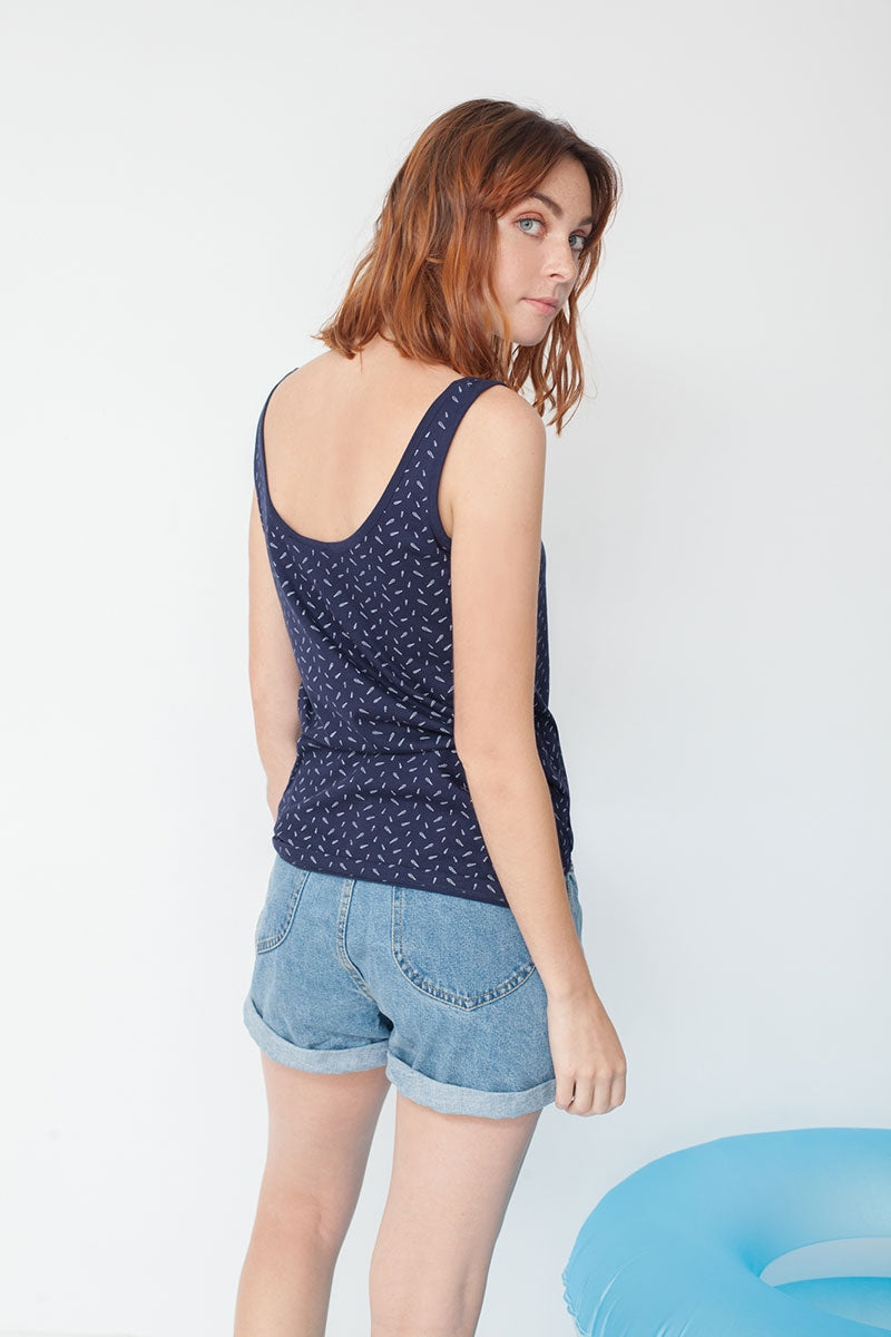 Tank top Yoke in navy blue with seashells print and two covered buttons.