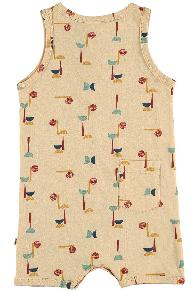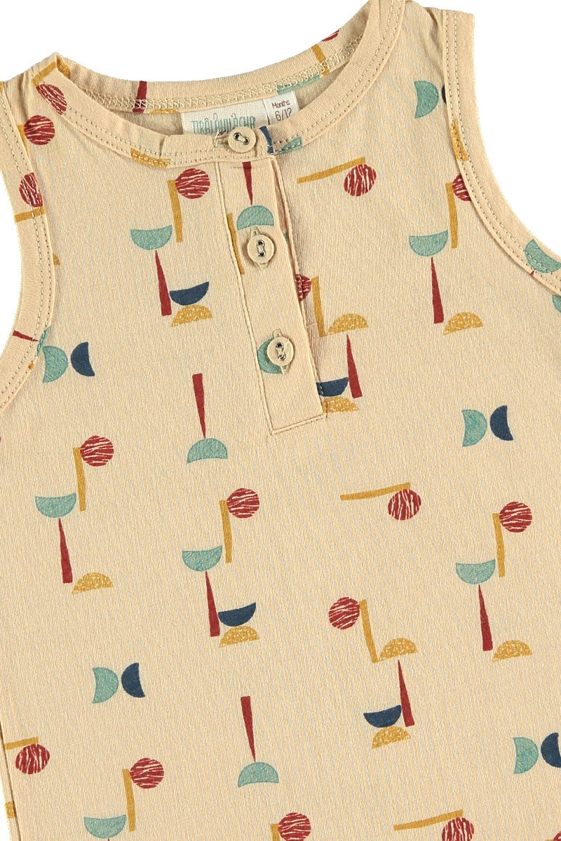 Mono de tirantes estampado abstracto. Es una prenda cómoda y muy suave al tacto. Lleva una tapeta con botones forrados y corchetes (libres de níquel) en la entre pierna para vestir fácilmente al bebé. Todas nuestras prendas están confeccionadas libres de tóxicos y son hipoalergénicas para la suave y delicada piel de tu pequeñx.