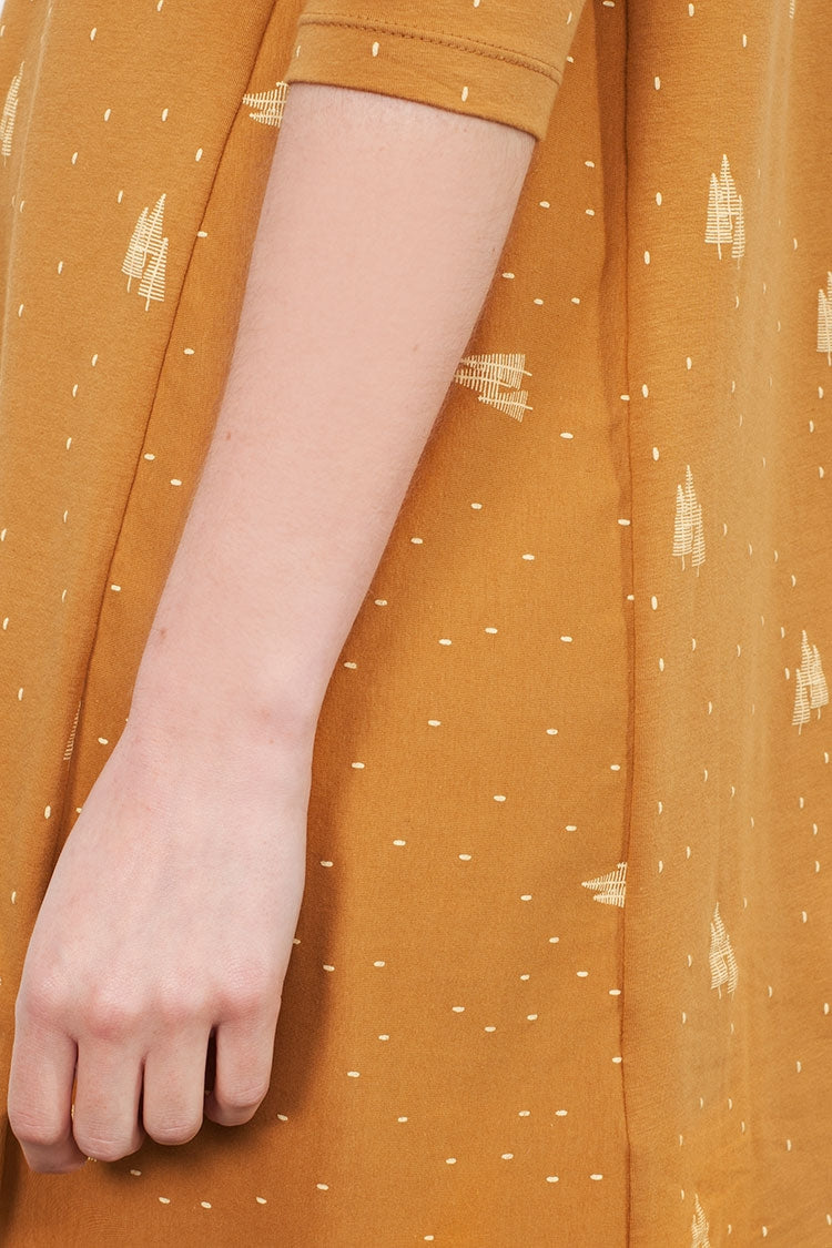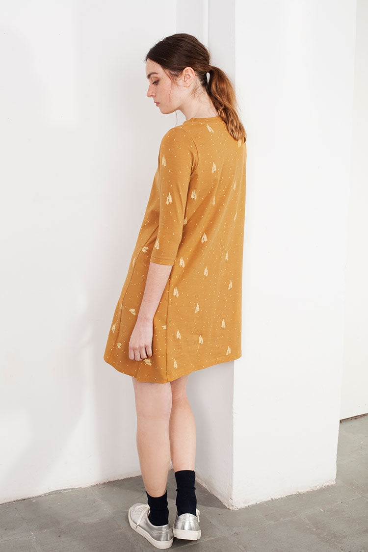 Flared dress in mustard with trees print. 95% Fair Trade Organic Cotton 5% Lycra.