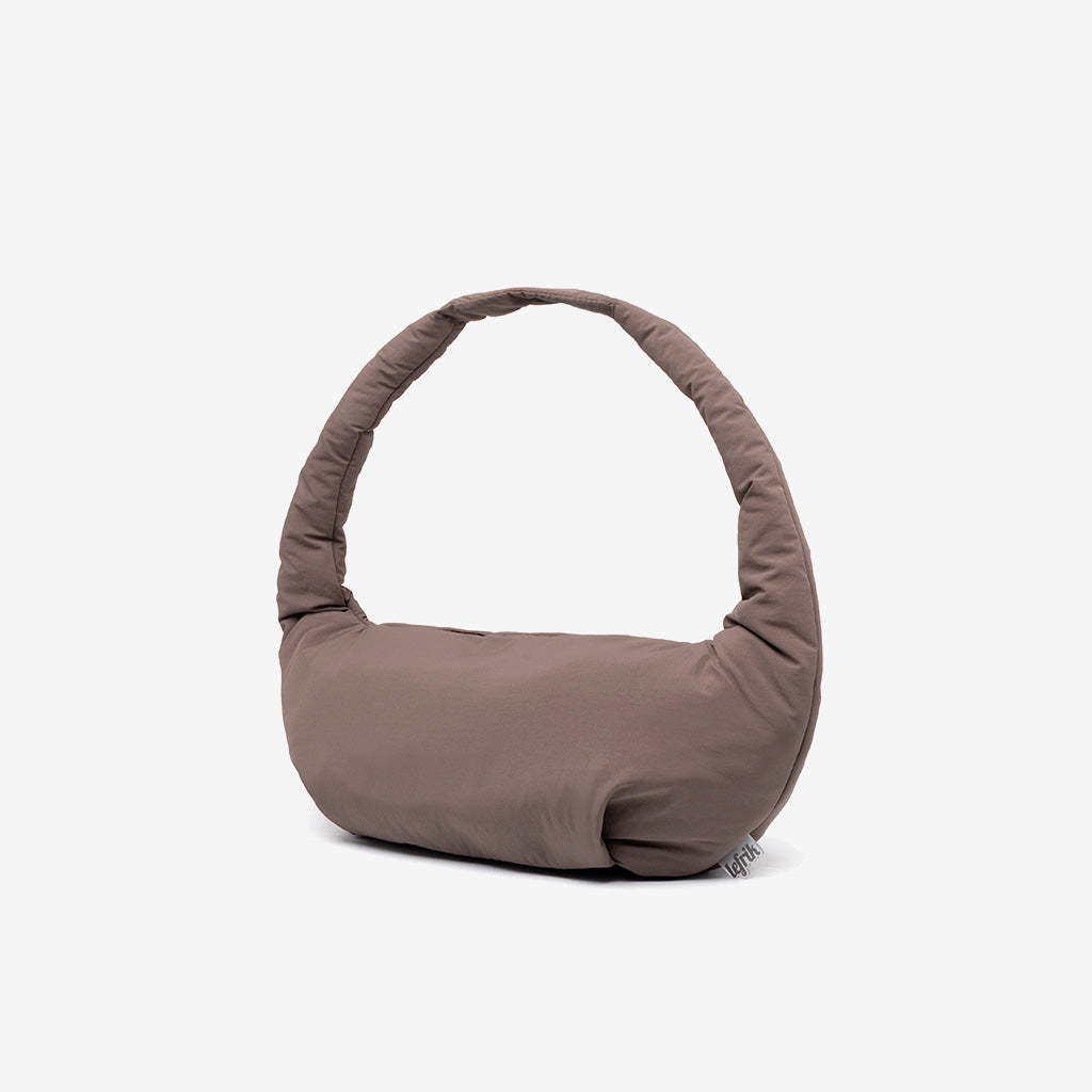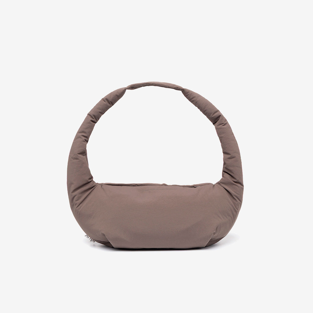 Mini version rounded shoulder bag featuring a seamless circular handle for a modern look.  Made from smooth, subtly textured recycled fabric, it closes securely with a top zipper to keep…