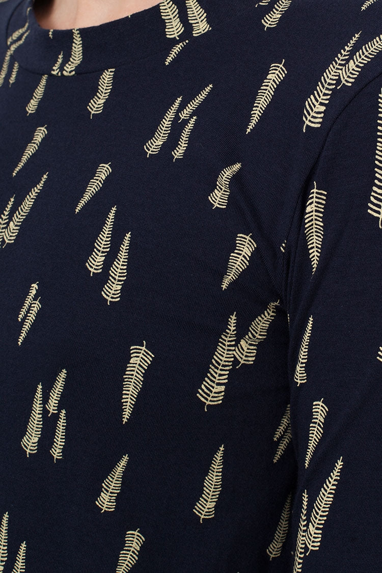 Long flared t’shirt in navy blue with leaves print. 95% Fair Trade Organic Cotton 5% Lycra.