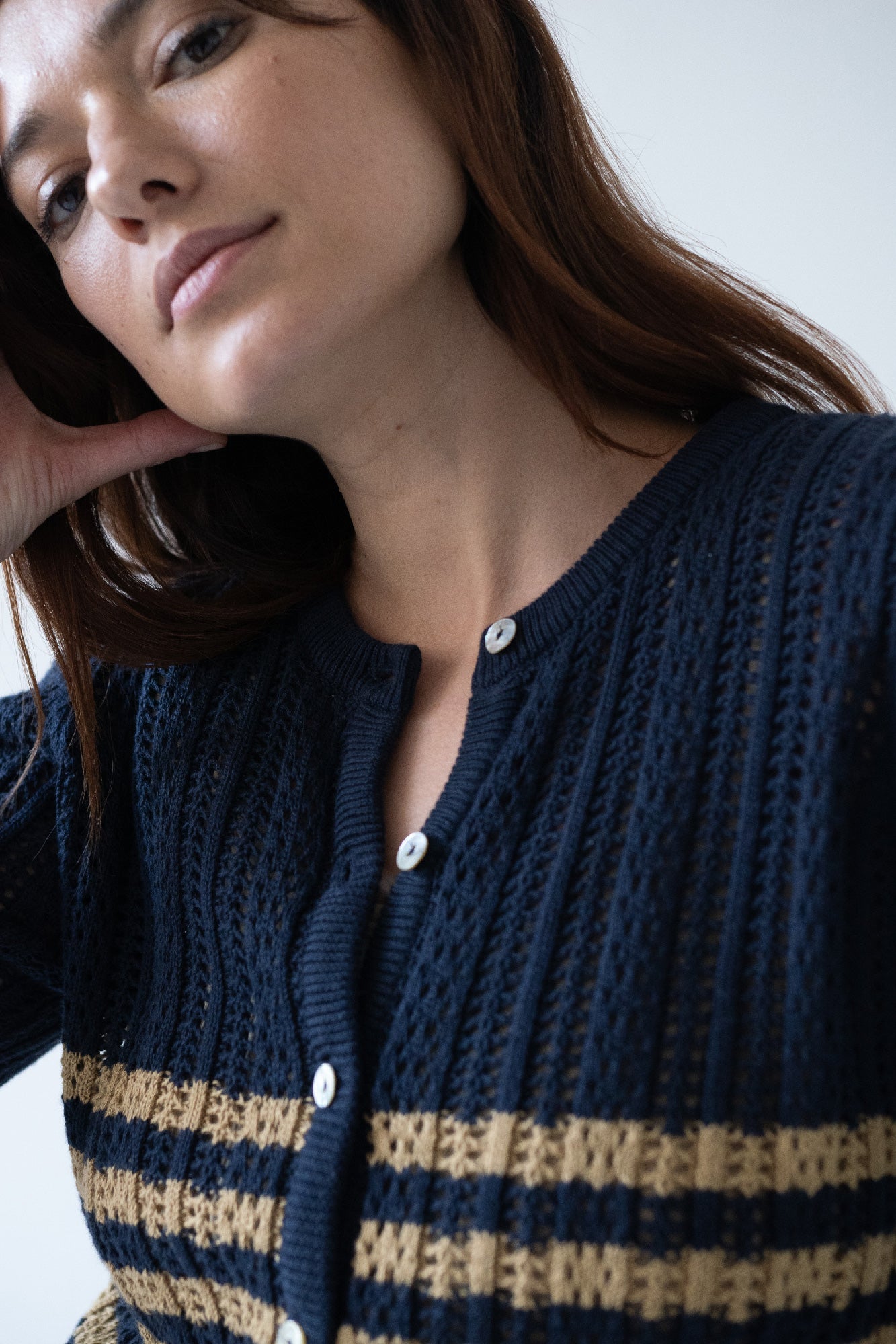 Bibi is a vintage-inspired openwork stitch cardigan. A garment that will embrace you during the transition seasons or Summer nights. It’s very soft and has a pleasant touch on the skin. It features natural nacre buttons and it’s crafted with high quality organic cotton knits in Spain. Navy blue conveys freedom, harmony and confidence.