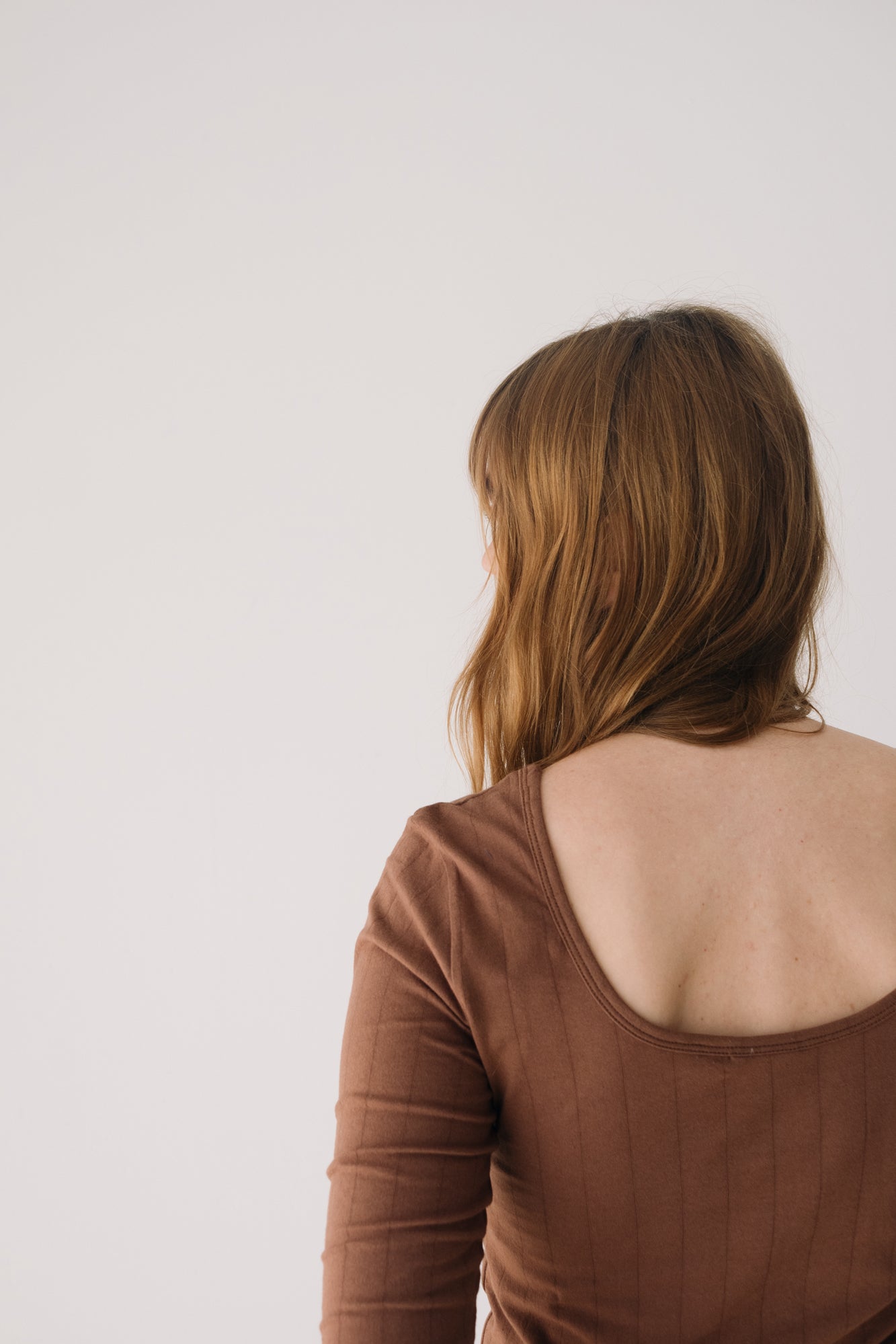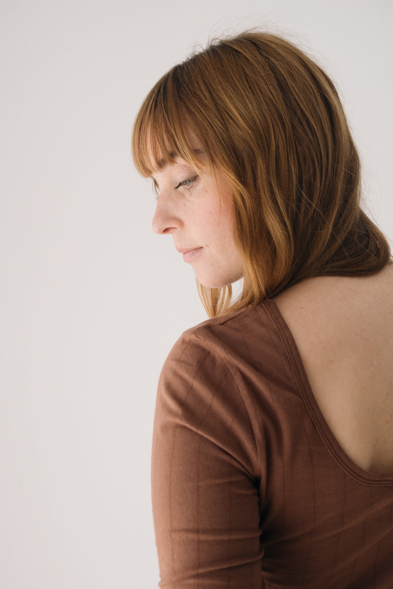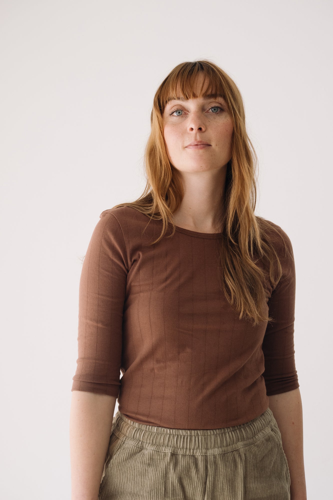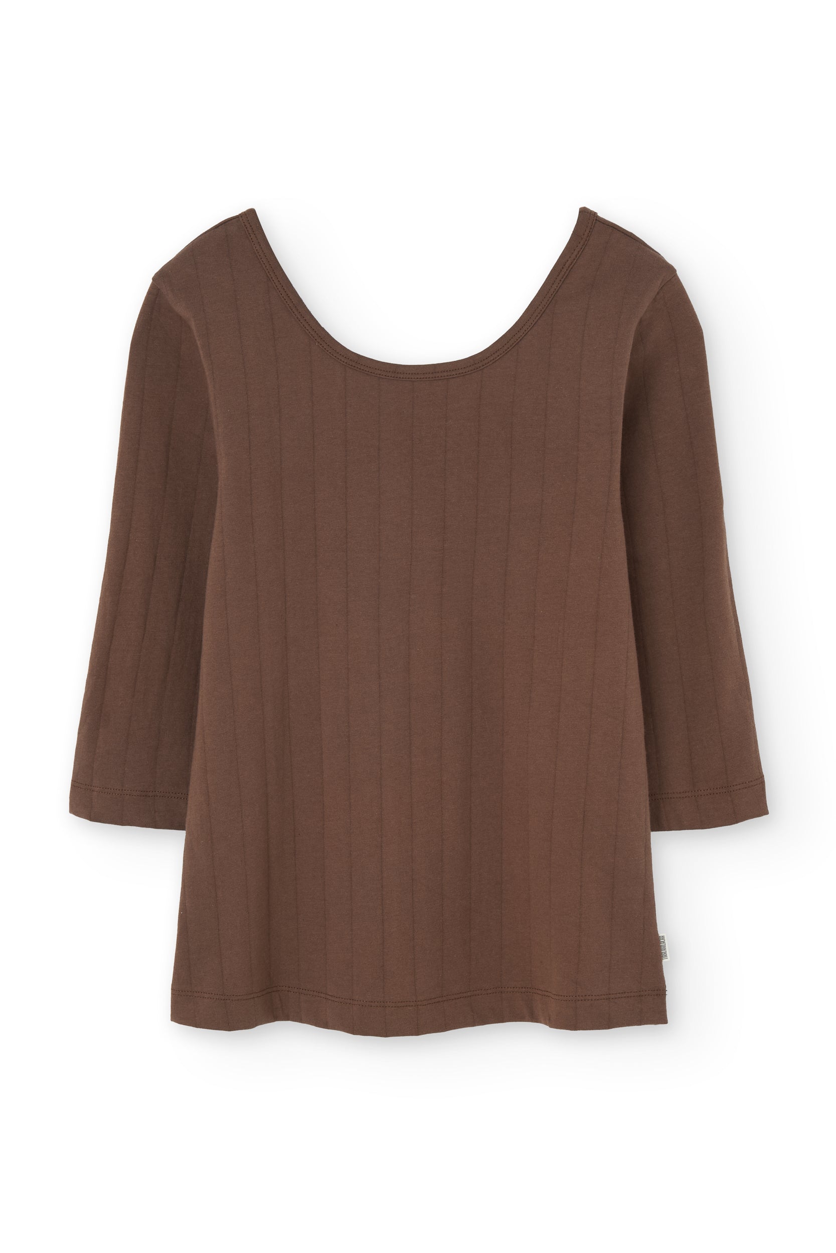 This Top with three-quarter sleeves and a boat neckline is a sustainable wardrobe essential. Its versatile and feminine design lets you style the neckline lower at the front or back, adapting to your look with ease. Made from GOTS-certified organic cotton rib fabric, this eco-friendly top has a soft, warm, and stretchy texture that flatters your shape without restricting movement. A timeless and comfortable piece to elevate any outfit. Brown evokes warmth, connection to the earth, and stability. A cozy and timeless shade that brings balance and depth to any look.