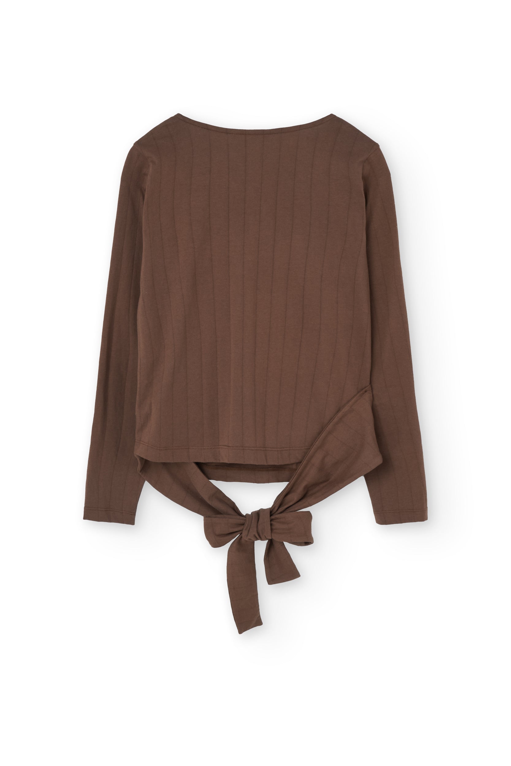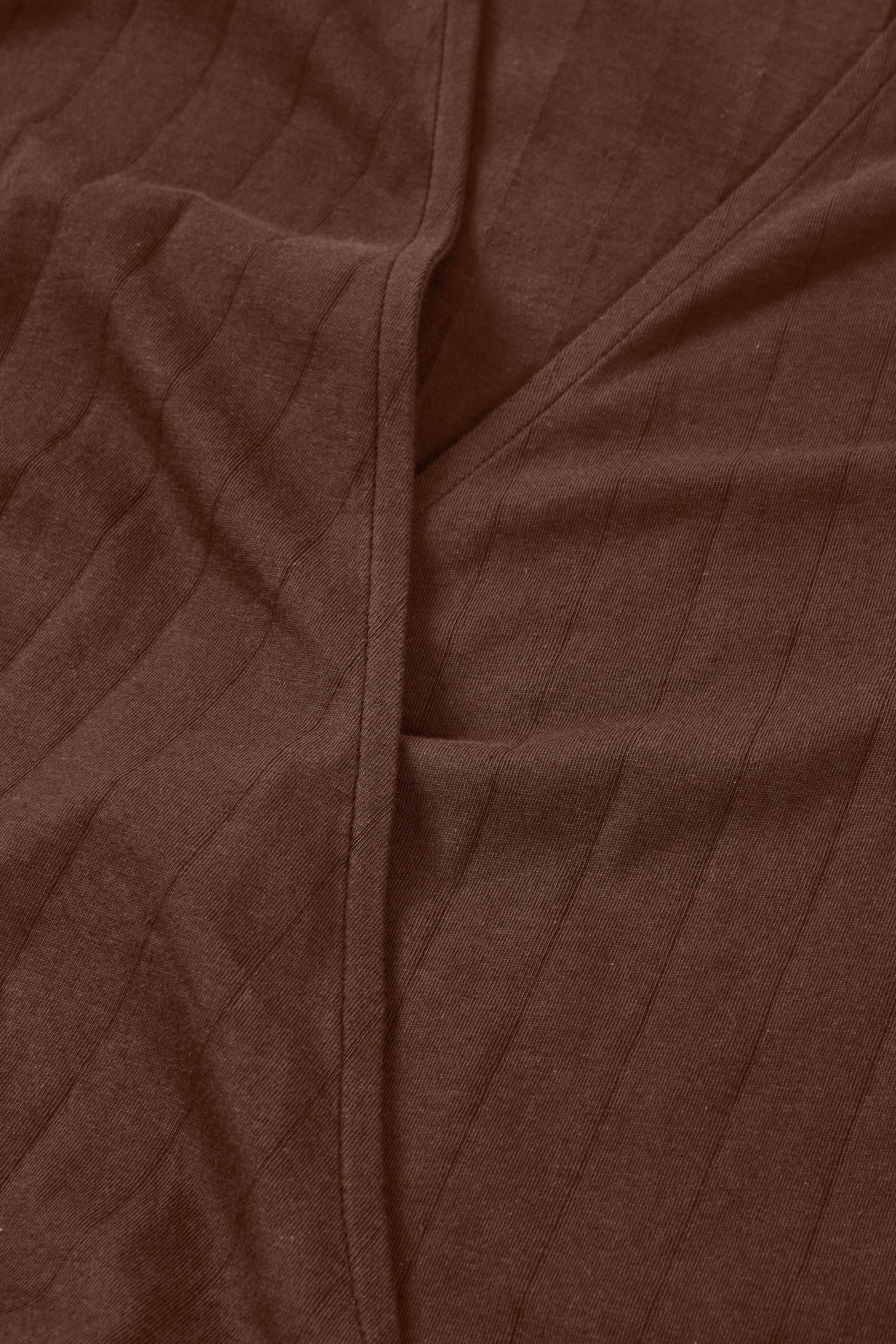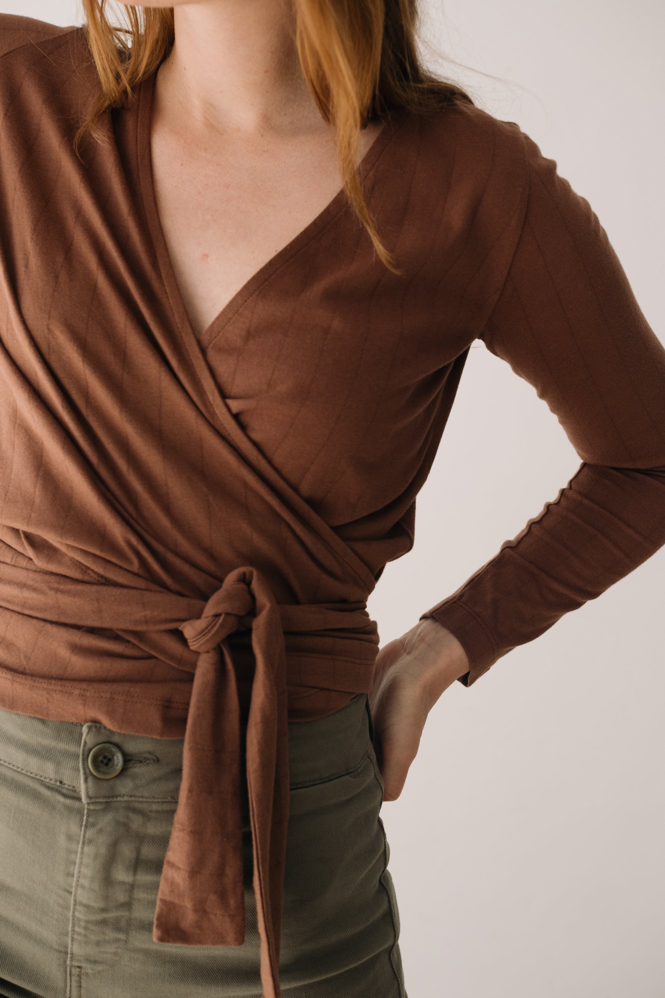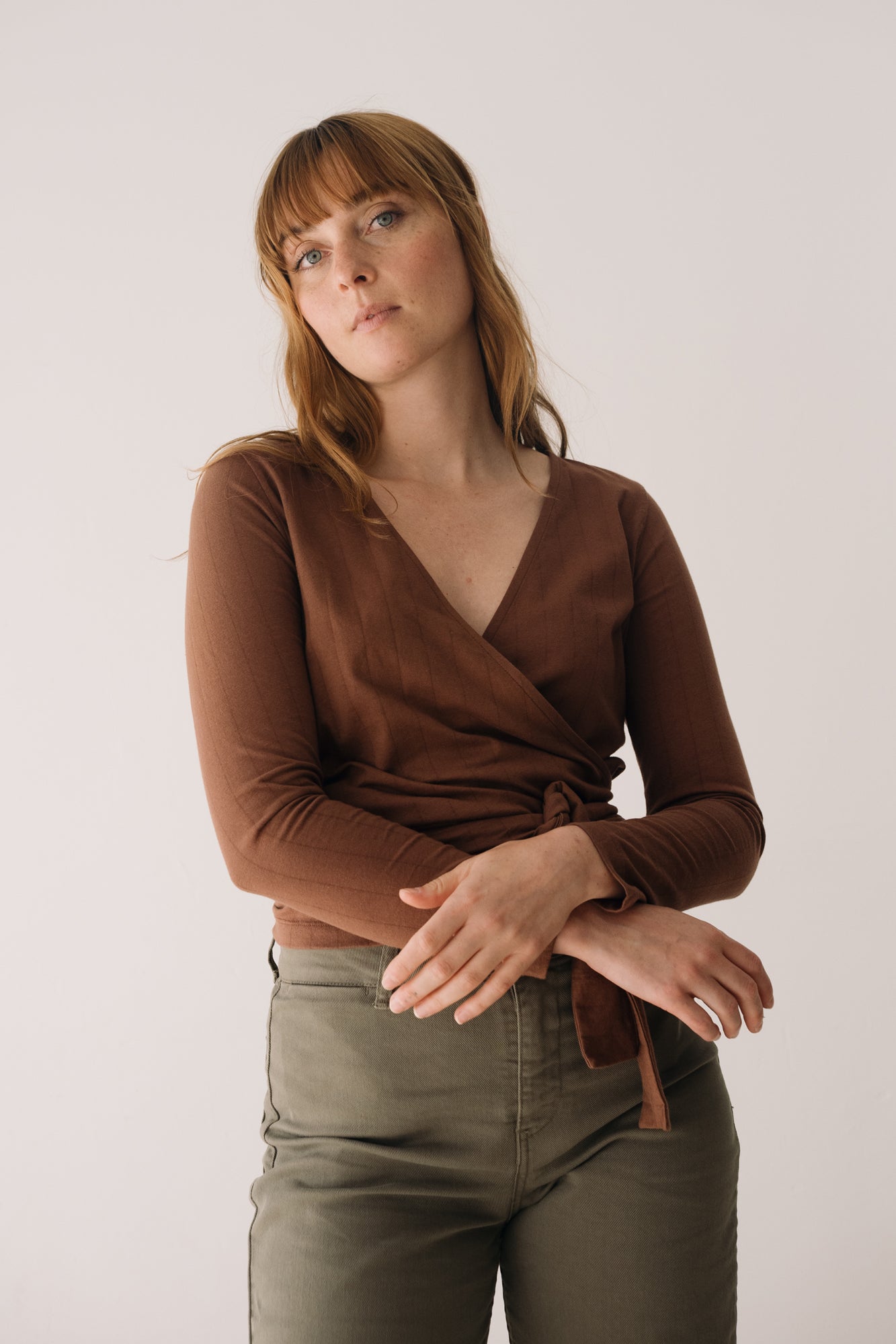 This Wrap Top in brown is a comfortable, feminine, and versatile piece designed to accompany you in your everyday life with style. A must-have essential for your sustainable wardrobe! Crafted from GOTS-certified organic cotton jersey, it features a soft, thick, and stretchy texture that adapts to your body without feeling tight. Its wrap design, with a V-neckline and tie at the waist, allows you to adjust the fit to your liking, naturally enhancing your silhouette. Brown evokes warmth, connection to the earth, and stability. A cozy and timeless shade that brings balance and depth to any look.