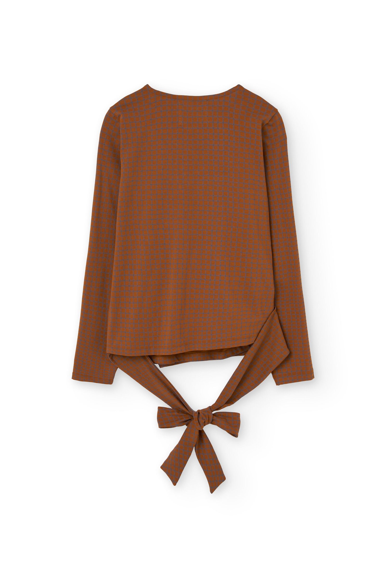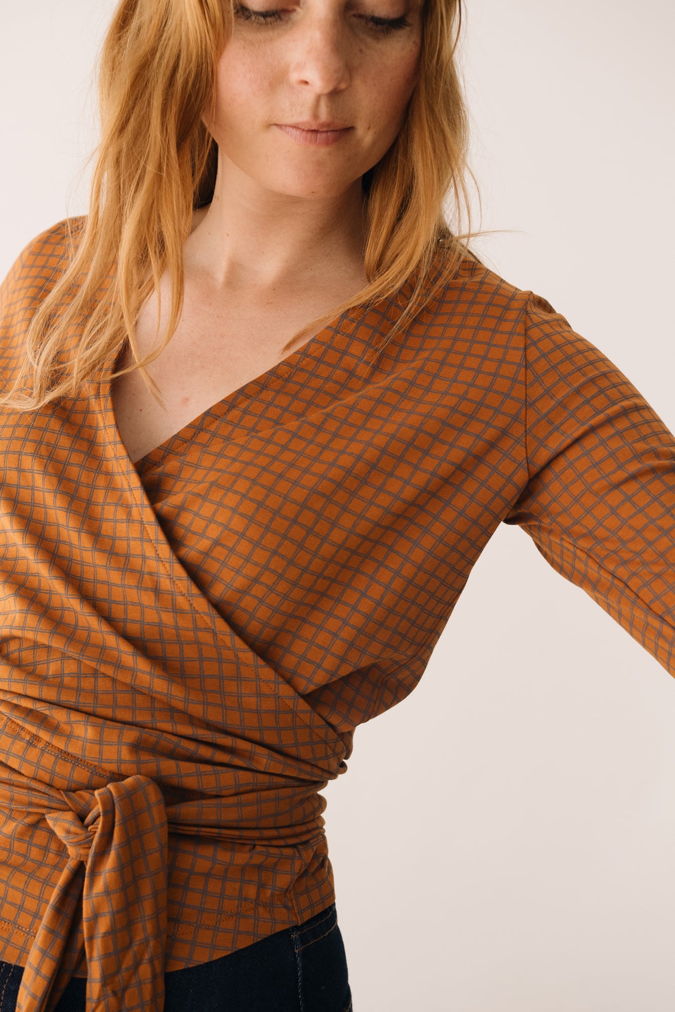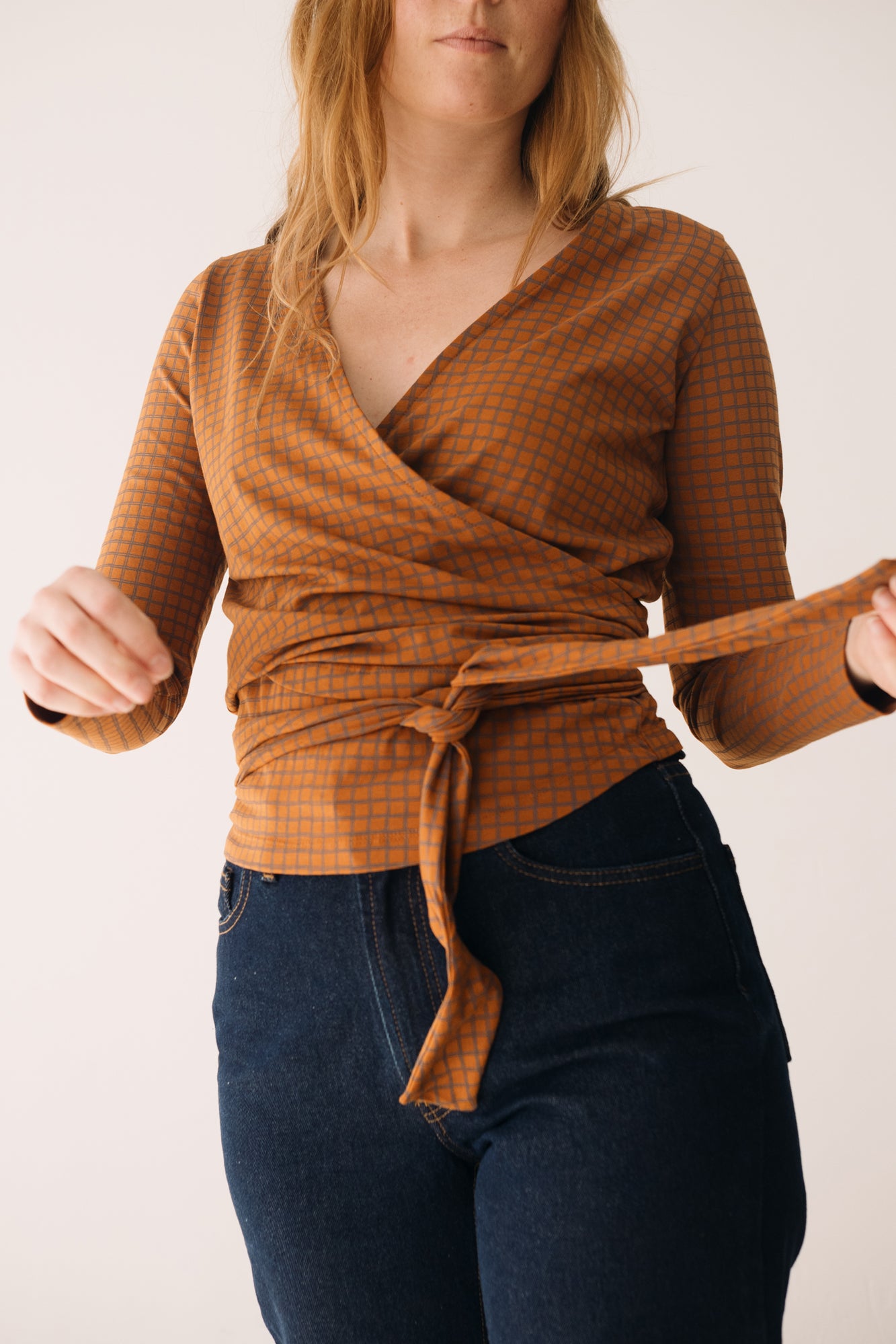 This Wrap Top in brown is a comfortable, feminine, and versatile piece designed to accompany you in your everyday life with style. A must-have essential for your sustainable wardrobe! Crafted from GOTS-certified organic cotton jersey, it features a soft, thick, and stretchy texture that adapts to your body without feeling tight. Its wrap design, with a V-neckline and tie at the waist, allows you to adjust the fit to your liking, naturally enhancing your silhouette. Its checkered pattern in terracotta and gray tones conveys warmth, creativity, and balance. A unique and harmonious plaid print that brings character and timeless style to any outfit.