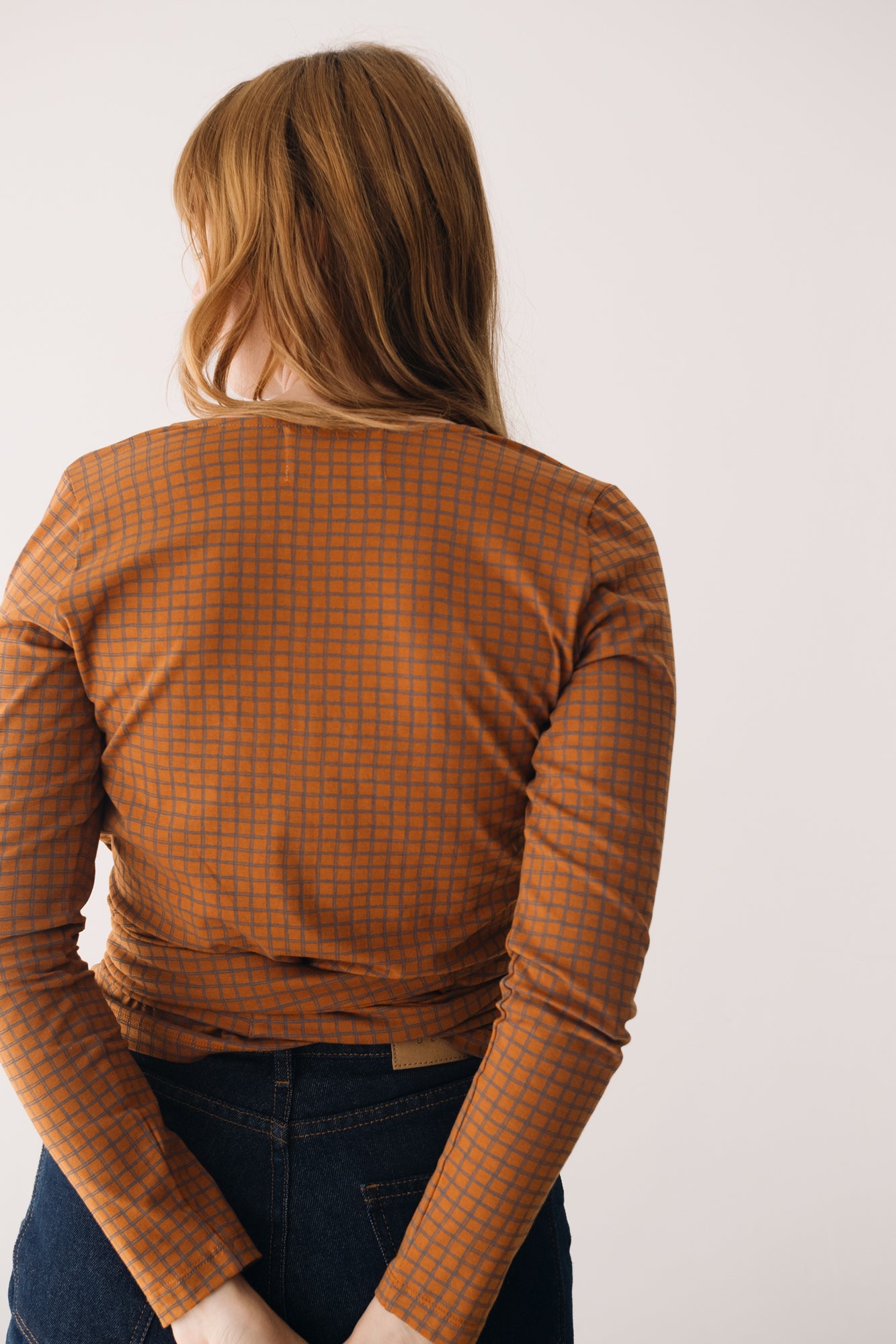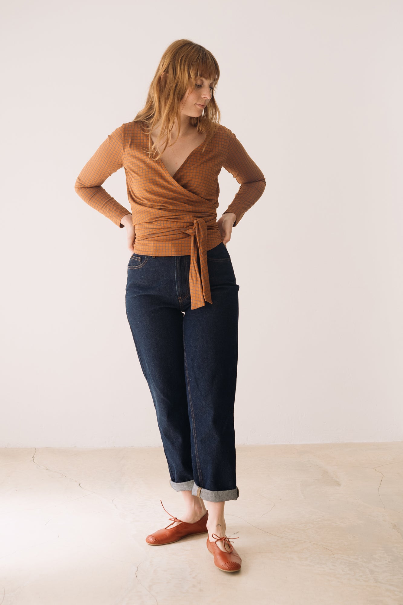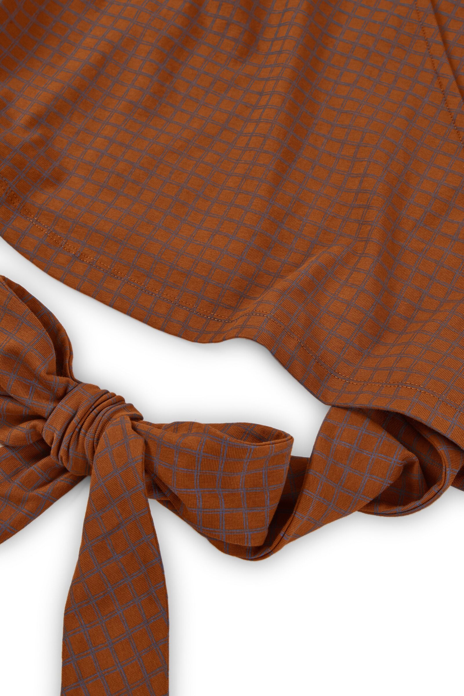 This Wrap Top in brown is a comfortable, feminine, and versatile piece designed to accompany you in your everyday life with style. A must-have essential for your sustainable wardrobe! Crafted from GOTS-certified organic cotton jersey, it features a soft, thick, and stretchy texture that adapts to your body without feeling tight. Its wrap design, with a V-neckline and tie at the waist, allows you to adjust the fit to your liking, naturally enhancing your silhouette. Its checkered pattern in terracotta and gray tones conveys warmth, creativity, and balance. A unique and harmonious plaid print that brings character and timeless style to any outfit.
