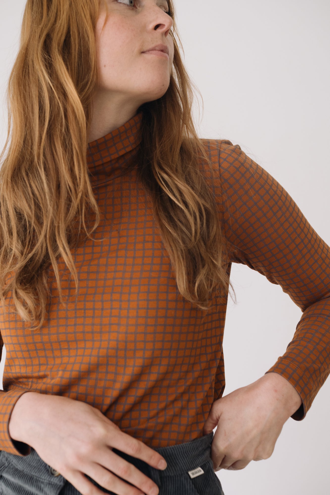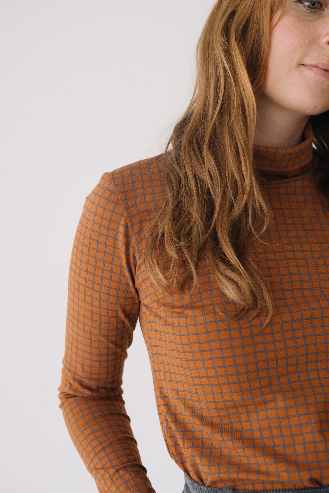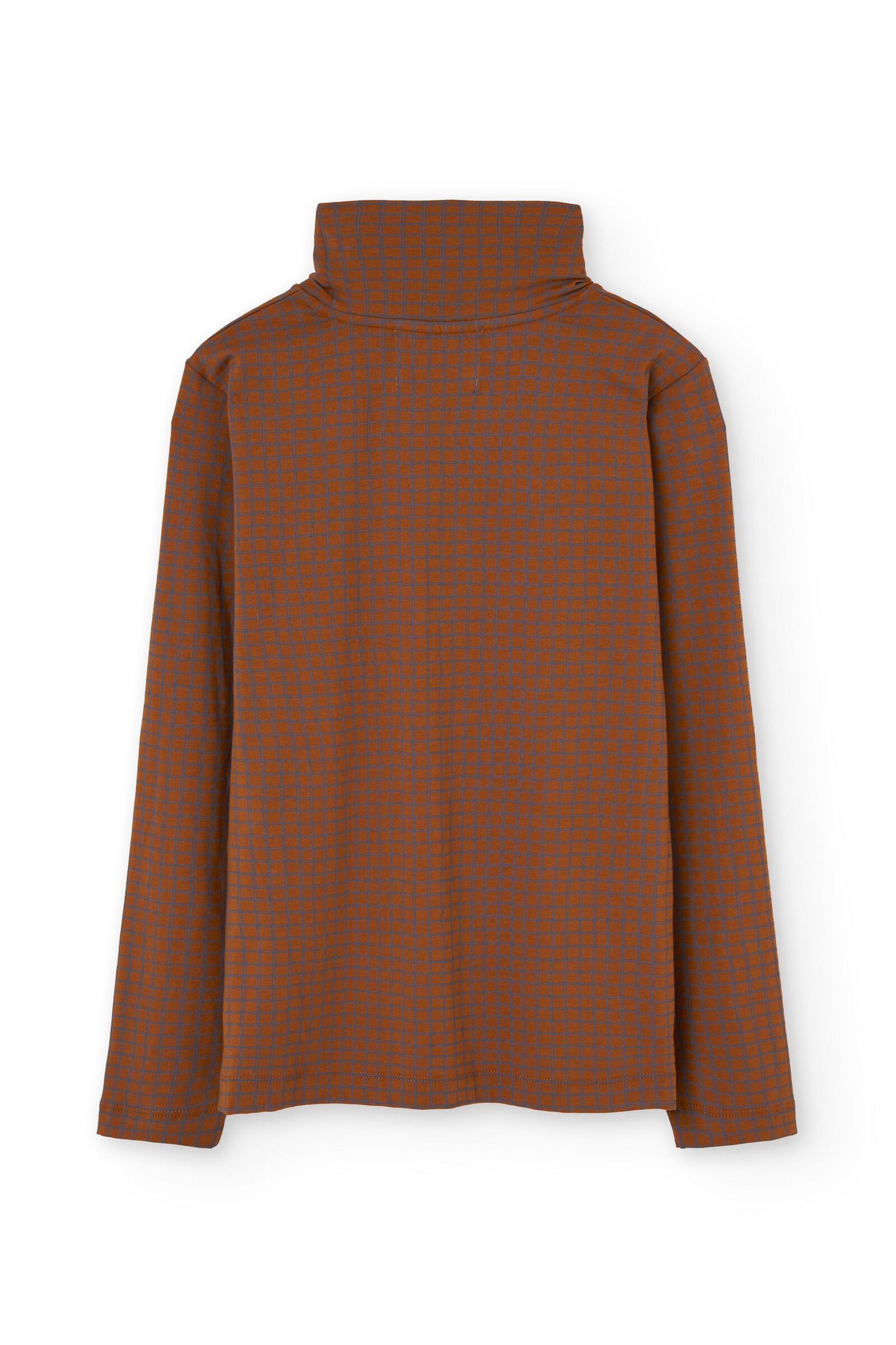 Our Turtleneck Top is a cozy and soft essential for the colder months. Designed with comfort and timeless style in mind, it’s a sustainable piece that elevates any wardrobe. Crafted from GOTS-certified organic cotton rib, it has a soft, warm, and stretchy texture that adapts to your body without feeling tight. Its checkered pattern in terracotta and gray tones conveys warmth, creativity, and balance. A unique and harmonious plaid print that brings character and timeless style to any outfit.