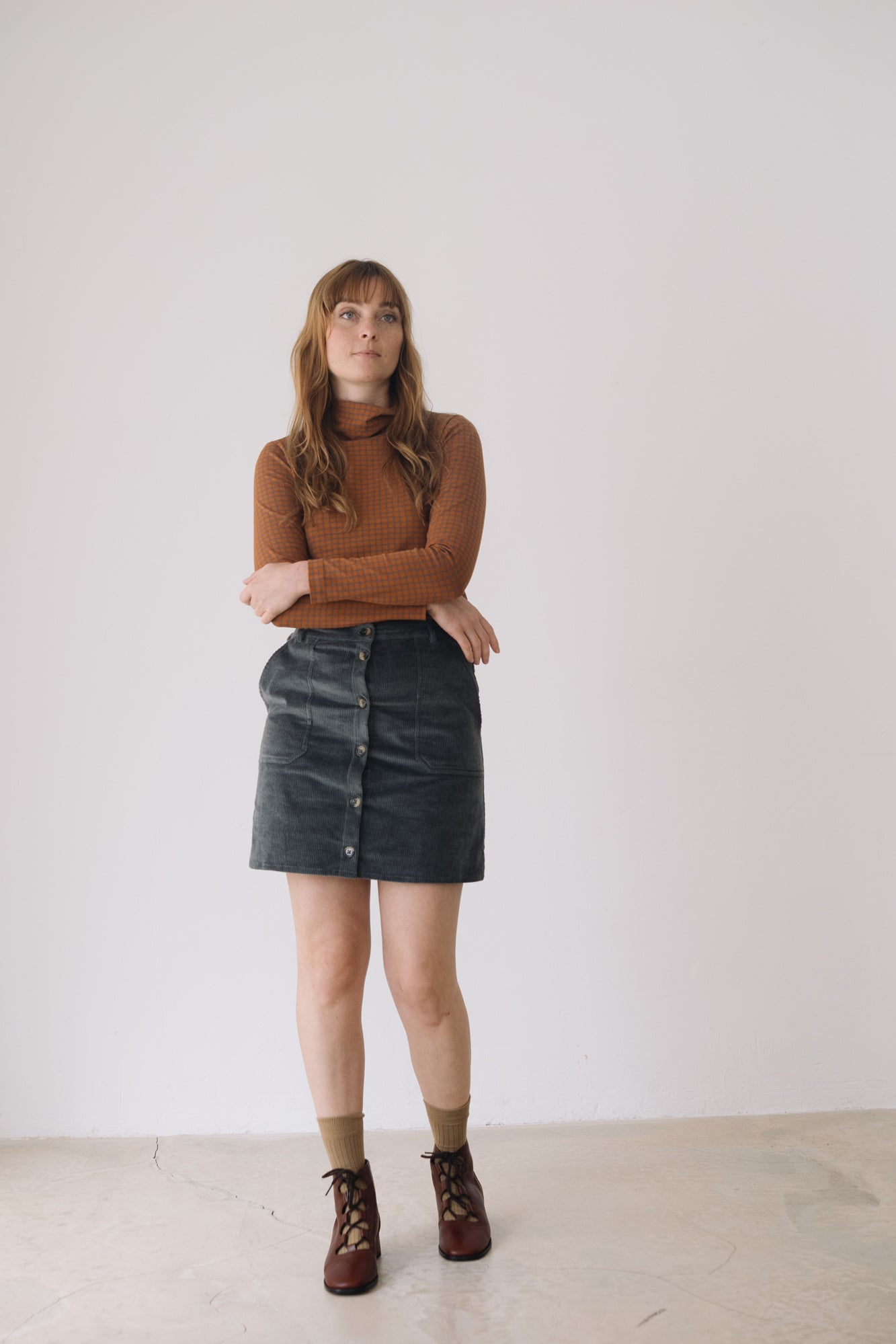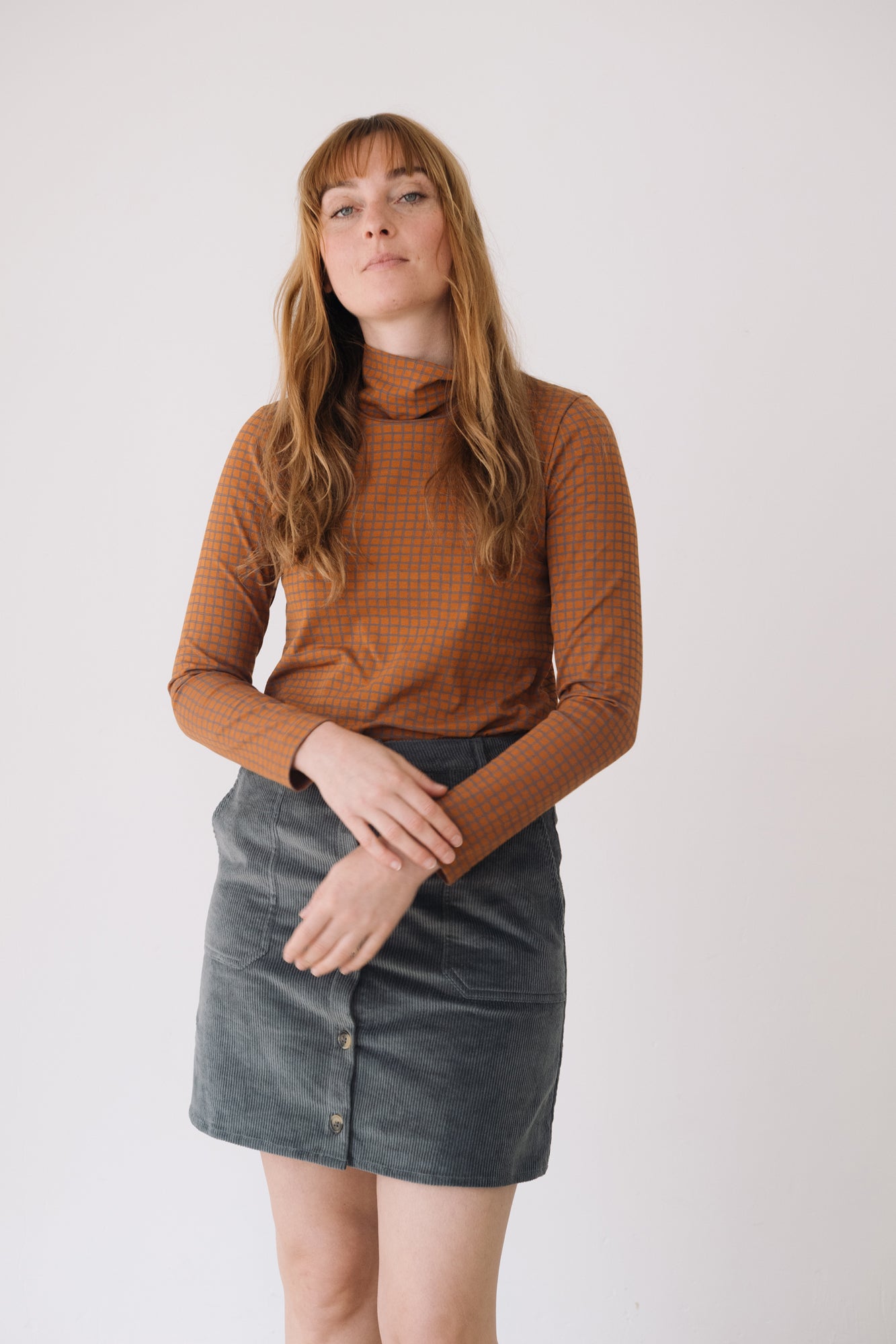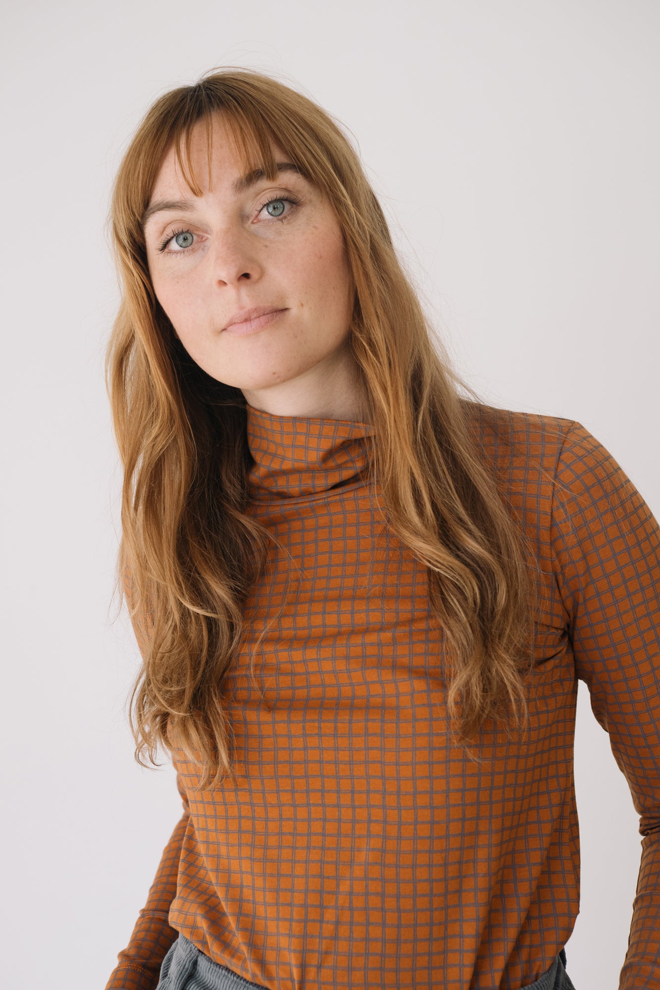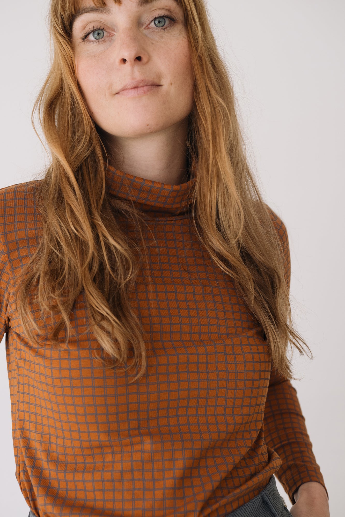 Our Turtleneck Top is a cozy and soft essential for the colder months. Designed with comfort and timeless style in mind, it’s a sustainable piece that elevates any wardrobe. Crafted from GOTS-certified organic cotton rib, it has a soft, warm, and stretchy texture that adapts to your body without feeling tight. Its checkered pattern in terracotta and gray tones conveys warmth, creativity, and balance. A unique and harmonious plaid print that brings character and timeless style to any outfit.