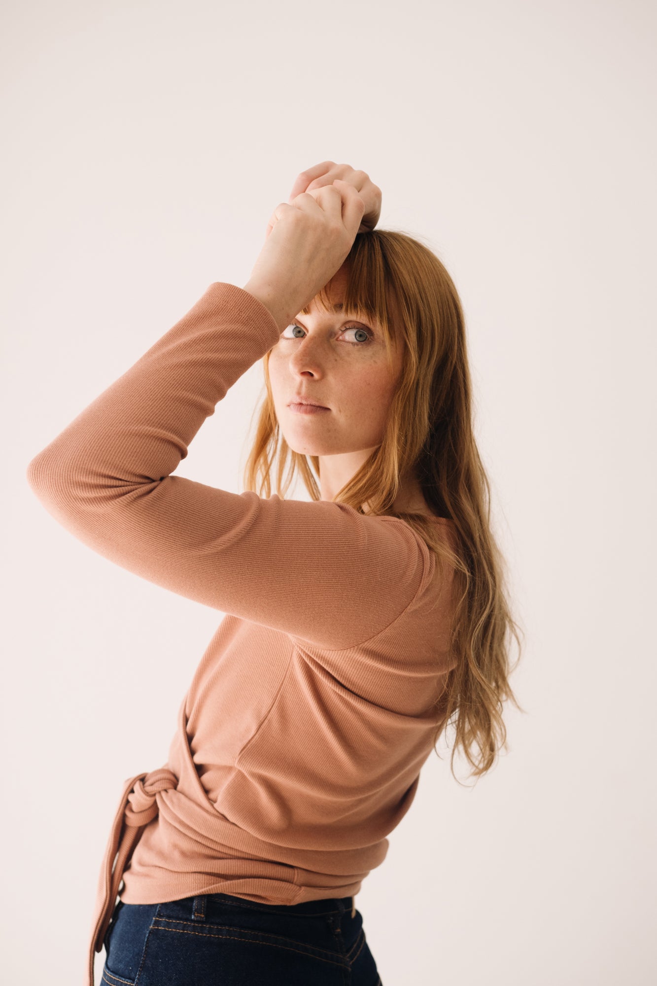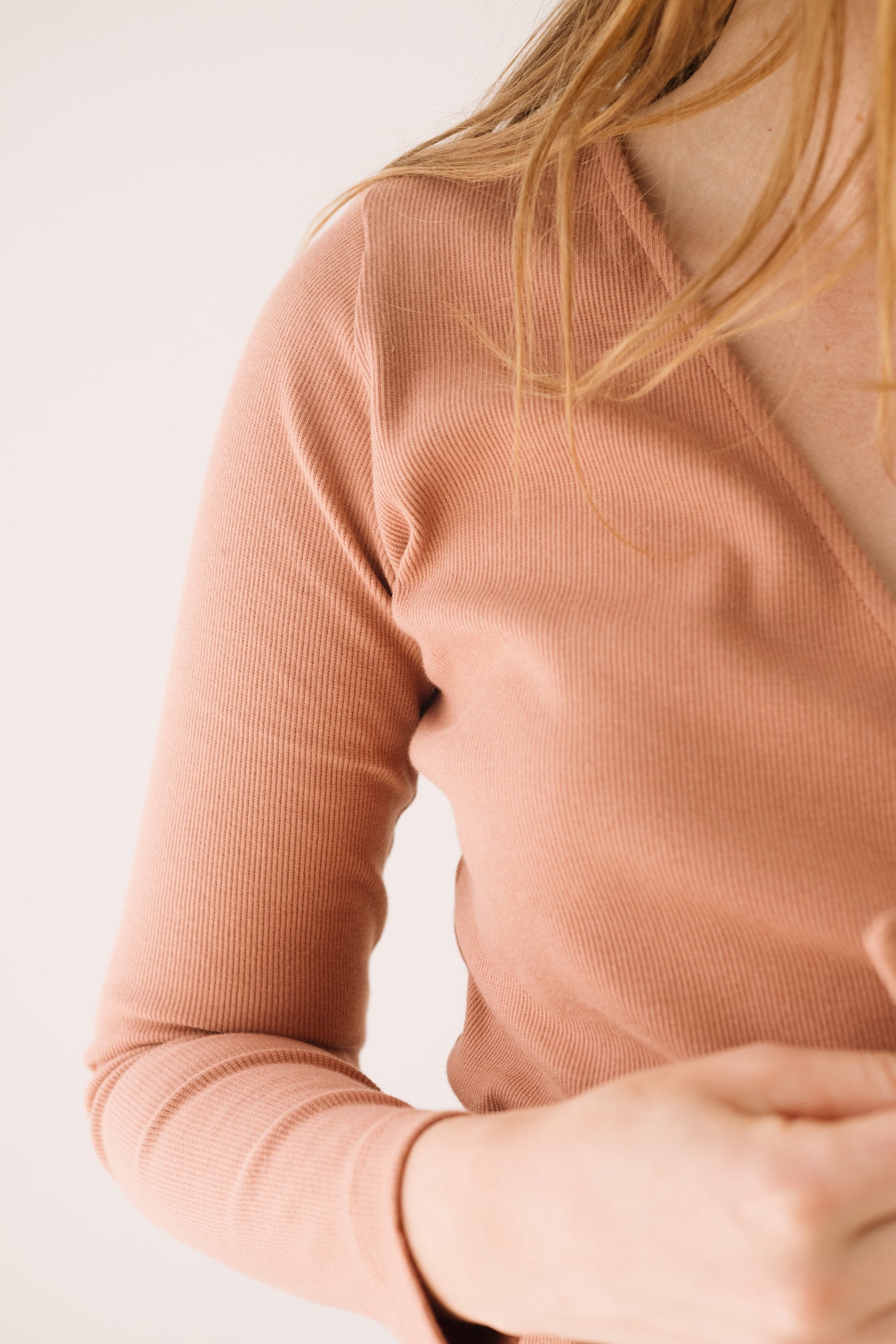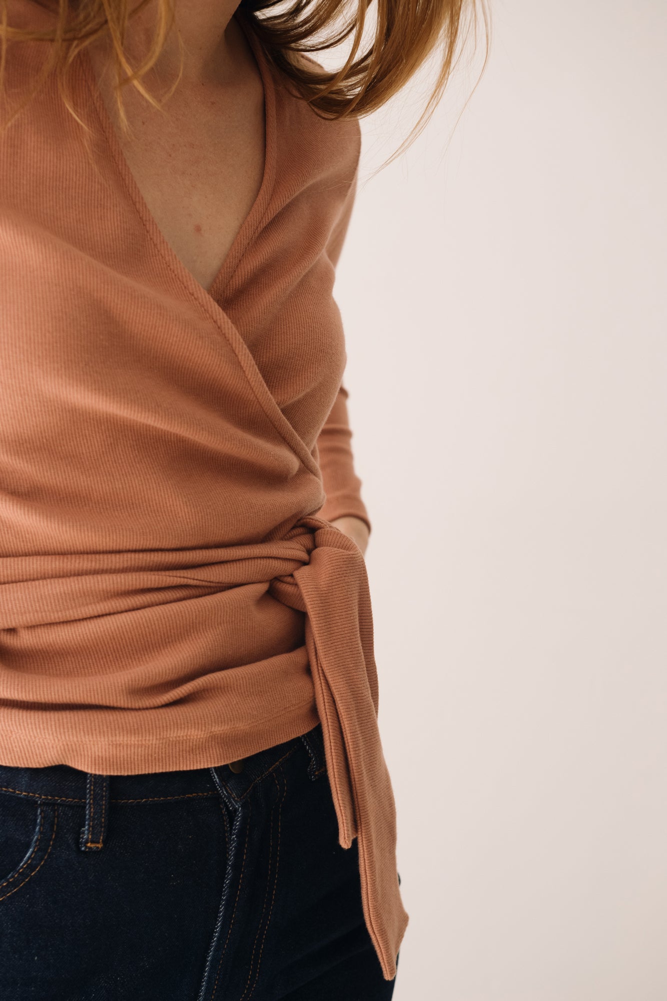 This Wrap Top in brown is a comfortable, feminine, and versatile piece designed to accompany you in your everyday life with style. A must-have essential for your sustainable wardrobe! Crafted from GOTS-certified organic cotton jersey, it features a soft, thick, and stretchy texture that adapts to your body without feeling tight. Its wrap design, with a V-neckline and tie at the waist, allows you to adjust the fit to your liking, naturally enhancing your silhouette. The dusty pink shade evokes sweetness, calm, and delicacy. This soft and timeless shade adds a romantic and serene touch to any look.