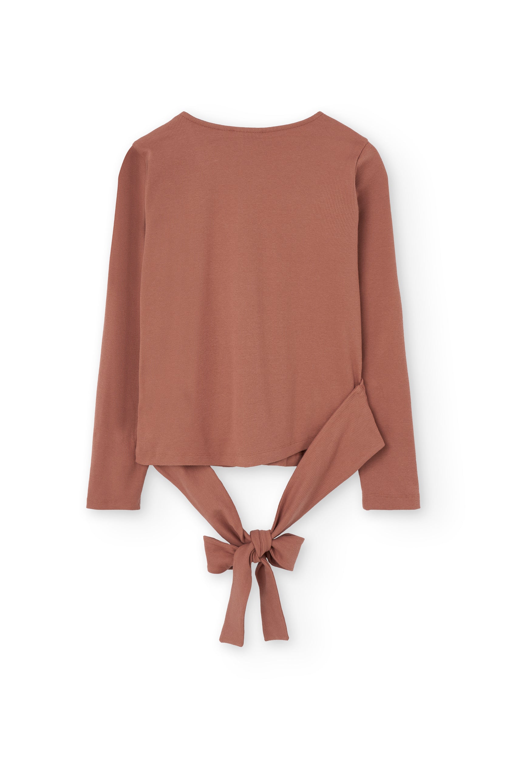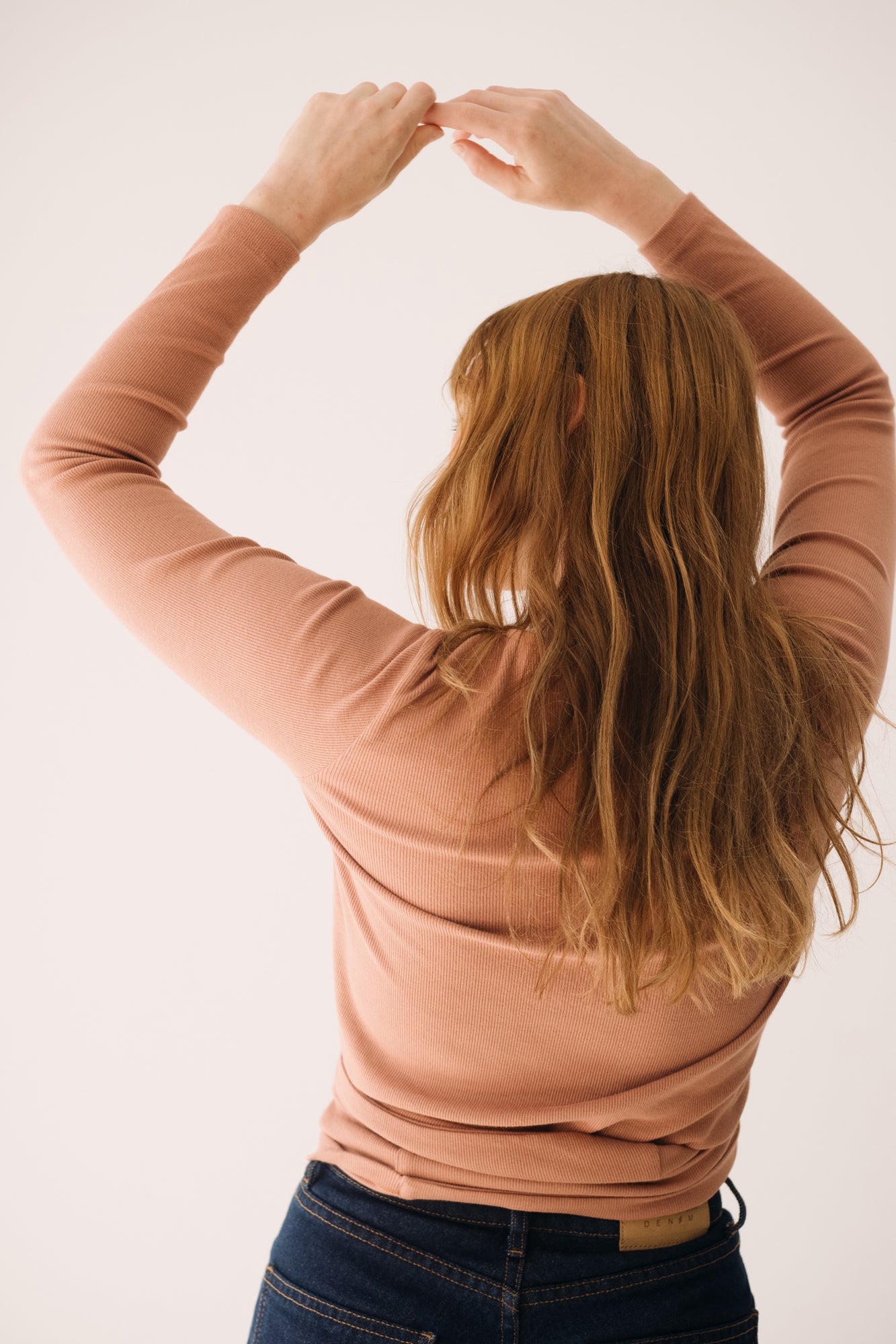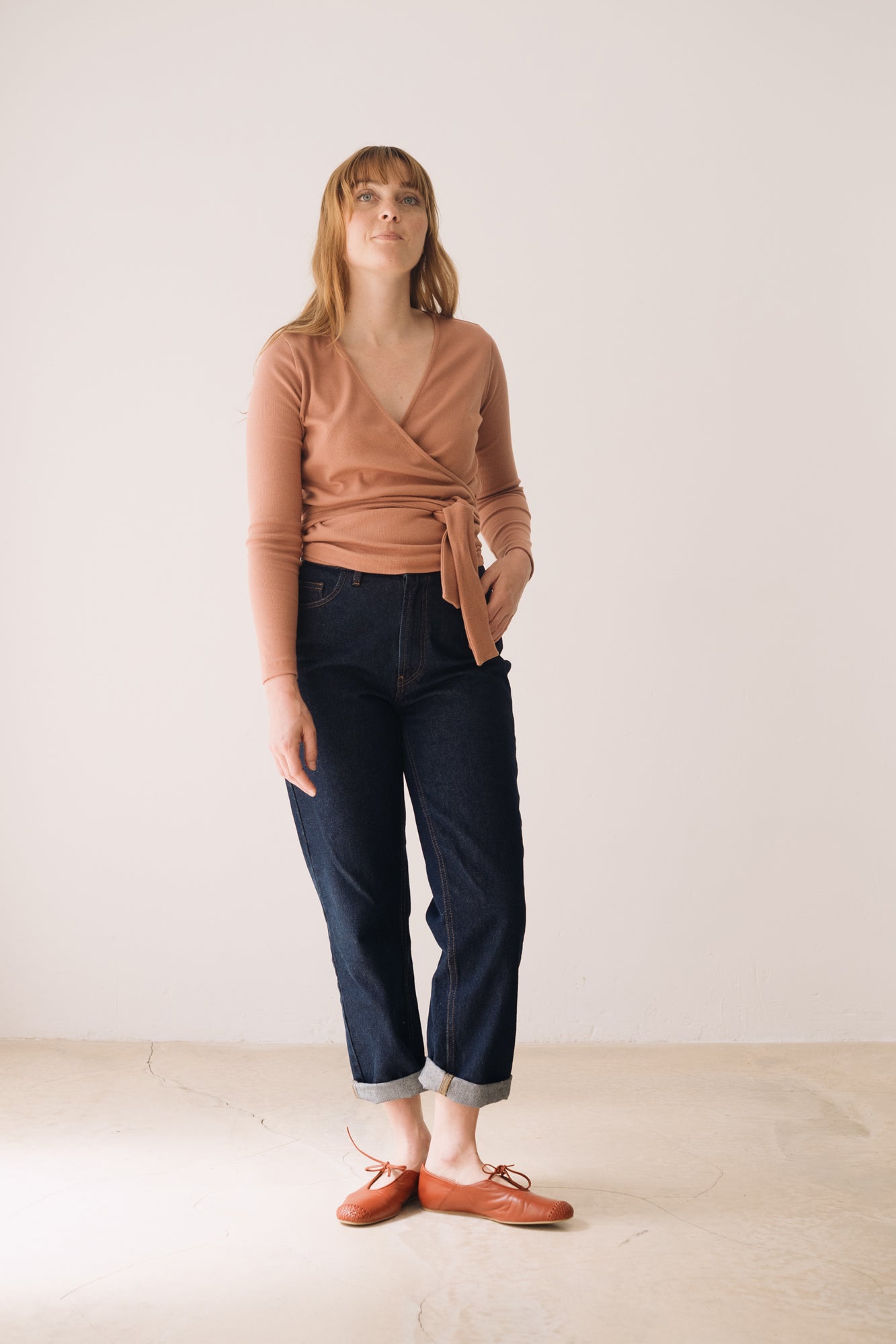 This Wrap Top in brown is a comfortable, feminine, and versatile piece designed to accompany you in your everyday life with style. A must-have essential for your sustainable wardrobe! Crafted from GOTS-certified organic cotton jersey, it features a soft, thick, and stretchy texture that adapts to your body without feeling tight. Its wrap design, with a V-neckline and tie at the waist, allows you to adjust the fit to your liking, naturally enhancing your silhouette. The dusty pink shade evokes sweetness, calm, and delicacy. This soft and timeless shade adds a romantic and serene touch to any look.