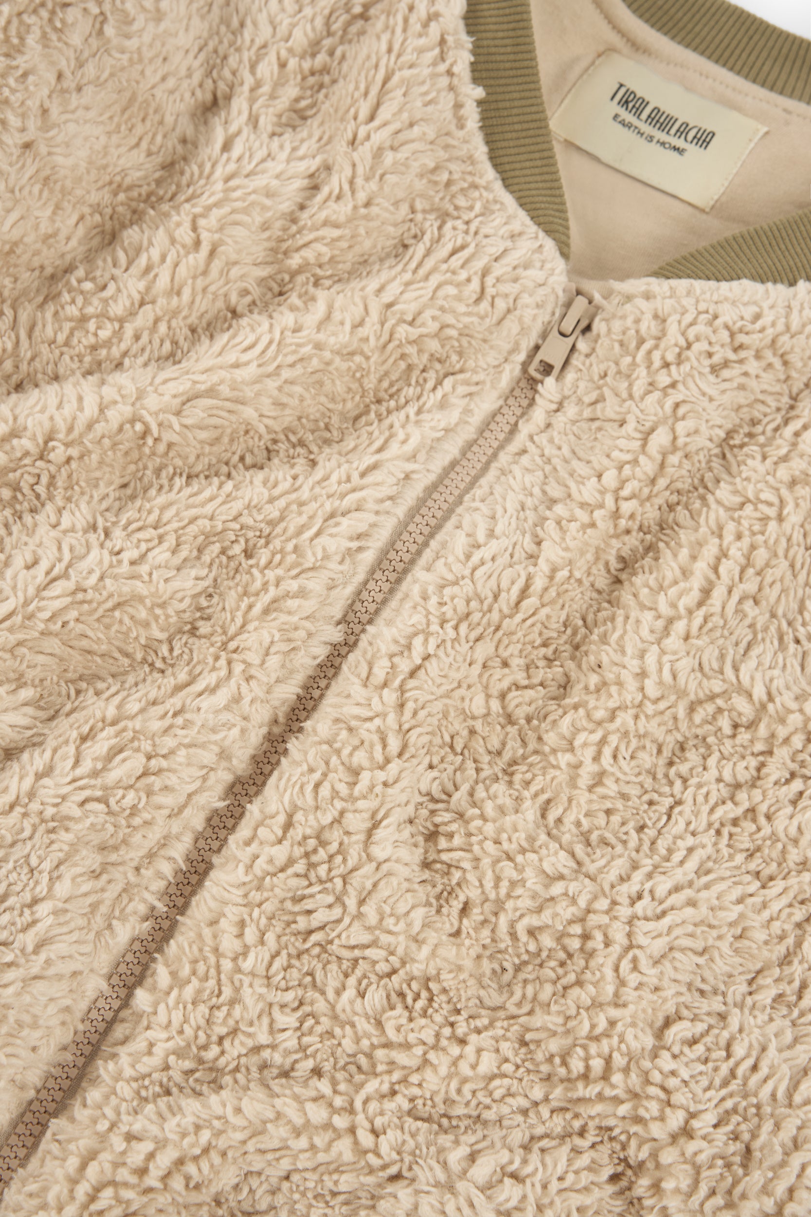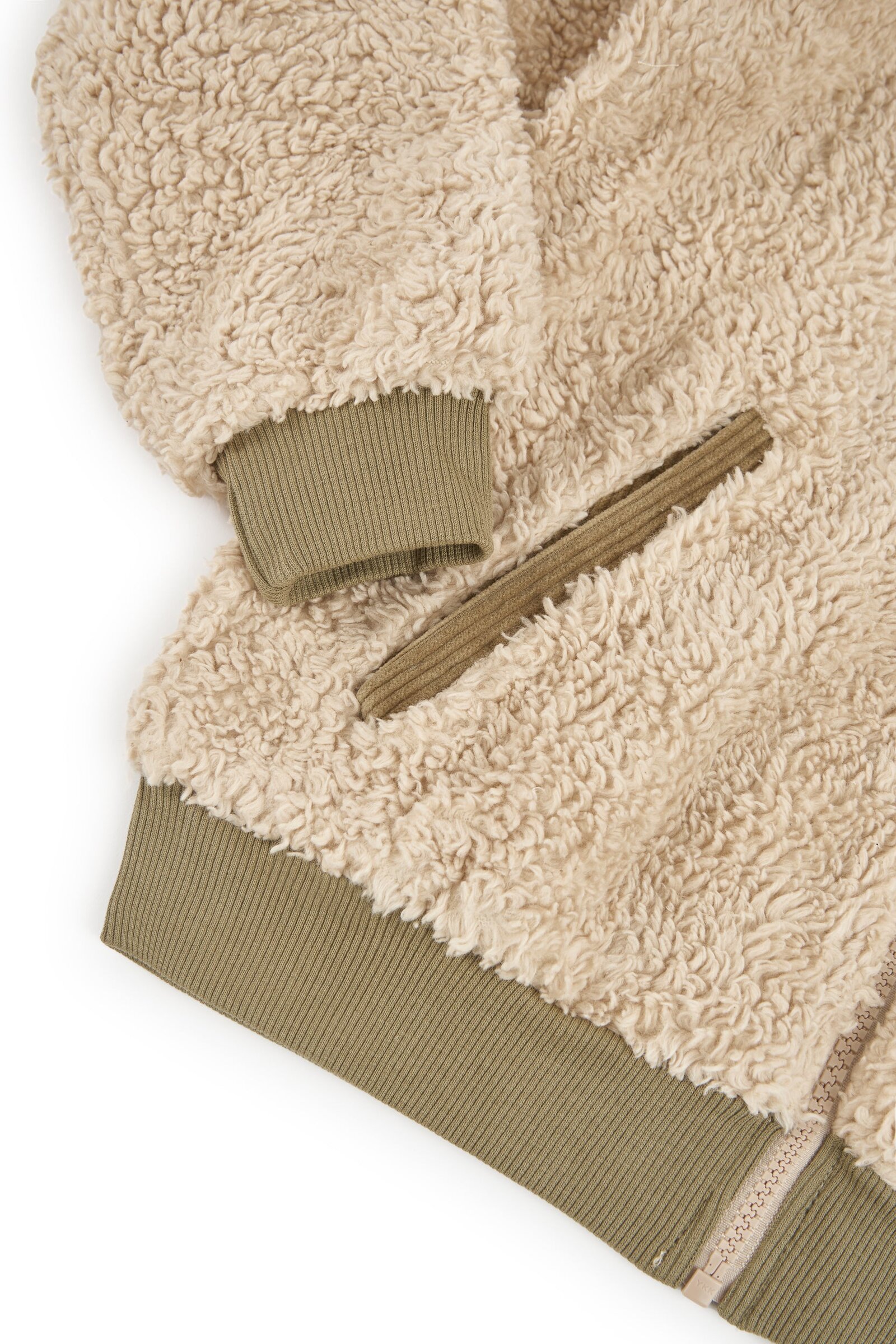 This Sherpa Jacket is a sustainable bomber-style piece designed for the coldest days—super warm, comfortable, and versatile. With a front zipper, corduroy side pockets, and contrasting ribbed trims, it combines function with style. Made from thick 100% GOTS-certified organic cotton Sherpa, this eco-friendly jacket has a soft, fluffy, and cozy texture that keeps you warm without sacrificing comfort. Fully lined with organic cotton jersey, it adds flexibility and an extra layer of insulation—perfect for winter wear. This neutral ecru shade evokes calm, warmth, and balance. Versatile and luminous, it pairs effortlessly with any outfit, adding serenity and timeless sophistication.