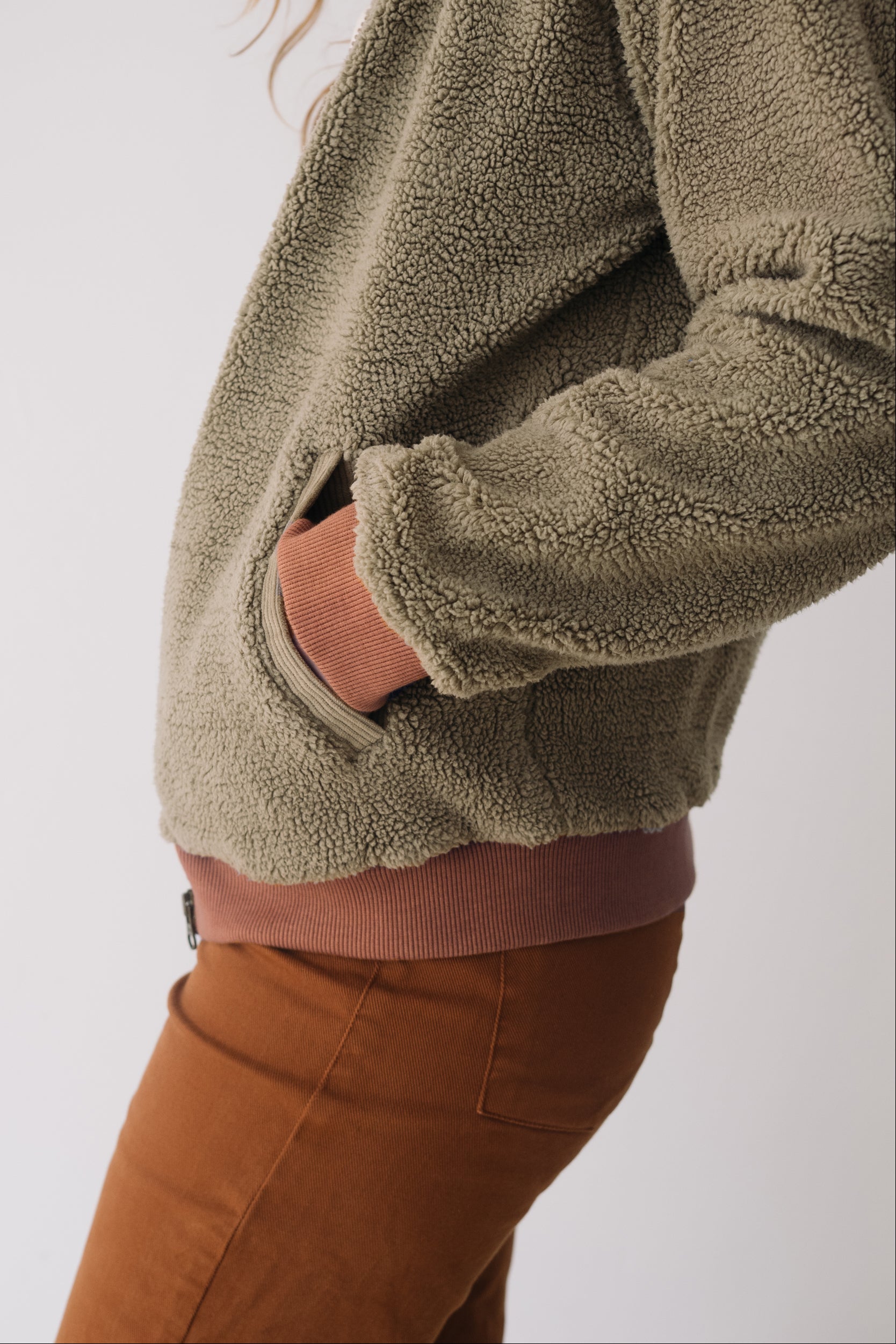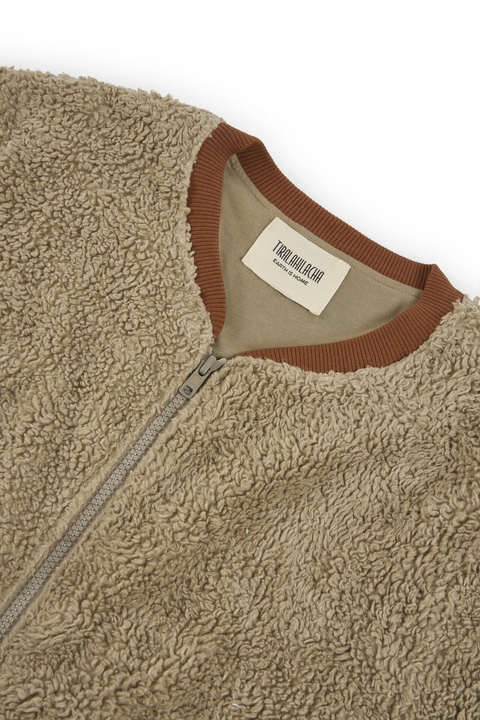 This Sherpa Jacket is a sustainable bomber-style piece designed for the coldest days—super warm, comfortable, and versatile. With a front zipper, corduroy side pockets, and contrasting ribbed trims, it combines function with style. Made from thick 100% GOTS-certified organic cotton sherpa, this eco-friendly jacket has a soft, fluffy, and cozy texture that keeps you warm without sacrificing comfort. Fully lined with organic cotton jersey, it adds flexibility and an extra layer of insulation—perfect for winter wear. This grass green shade evokes serenity and peace, while also conveying stability and a deep connection to the natural world.