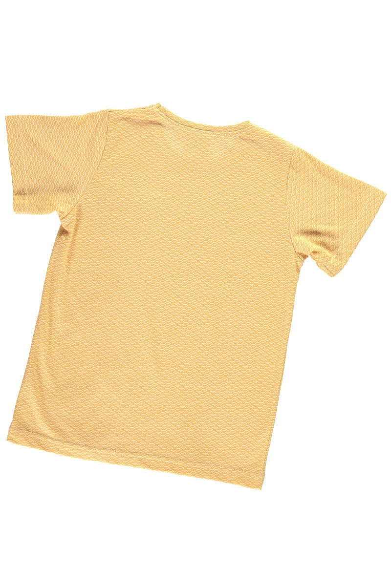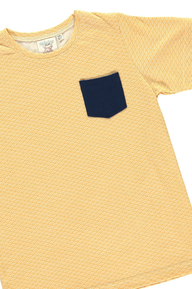 Organic cotton unisex t-shirt with pocket and round neck and short sleeves in honey yellow and japanese. 100% Certified Fair Trade Organic Cotton.