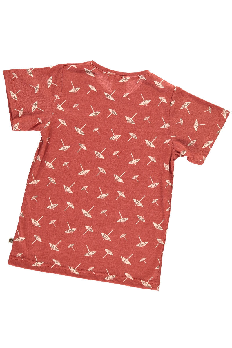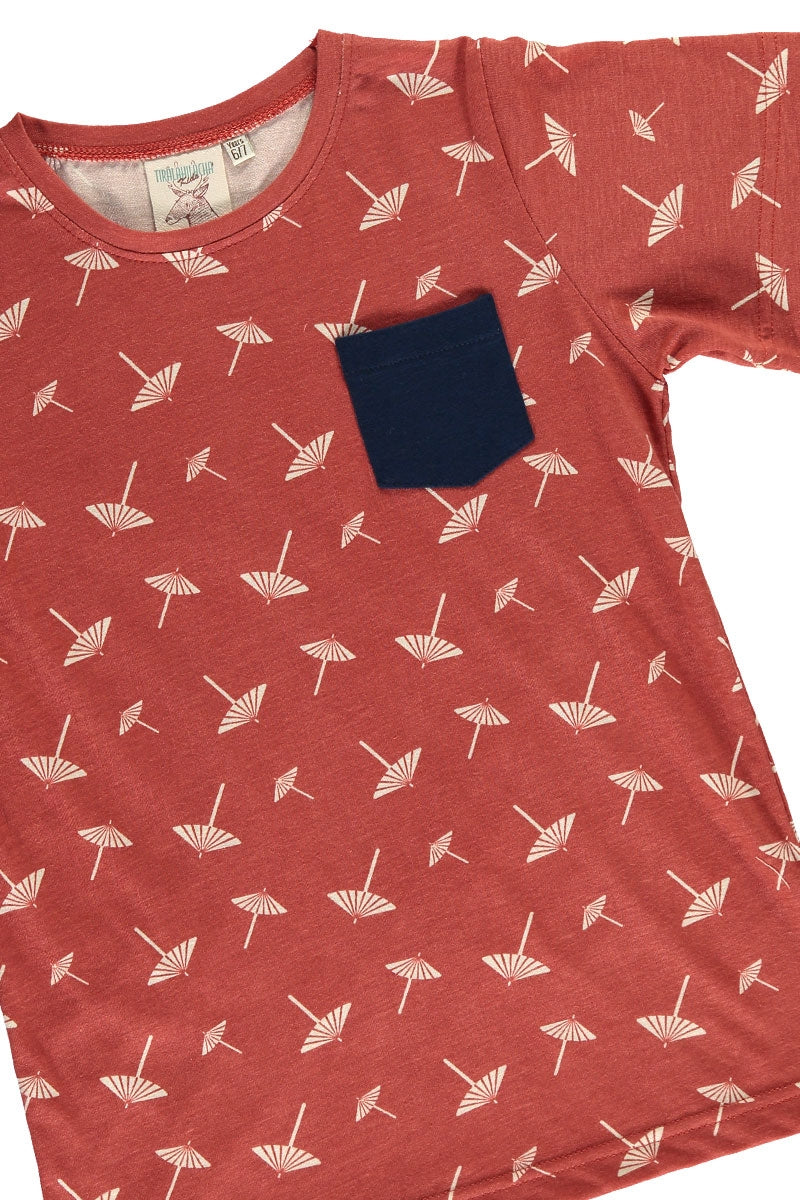 Organic cotton unisex t-shirt with pocket and round neck and short sleeves in terracotta and umbrella print. 100% Certified Fair Trade Organic Cotton.