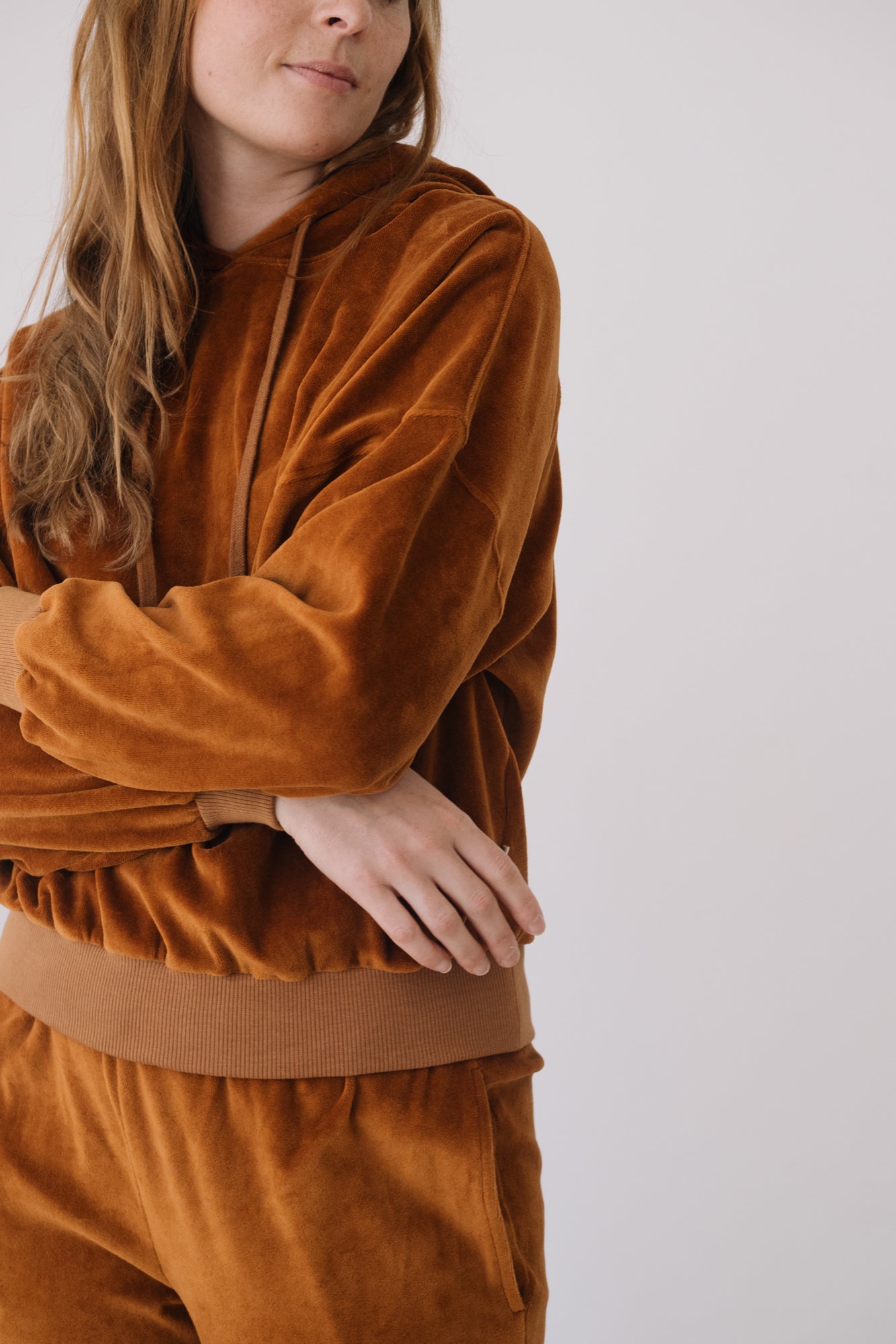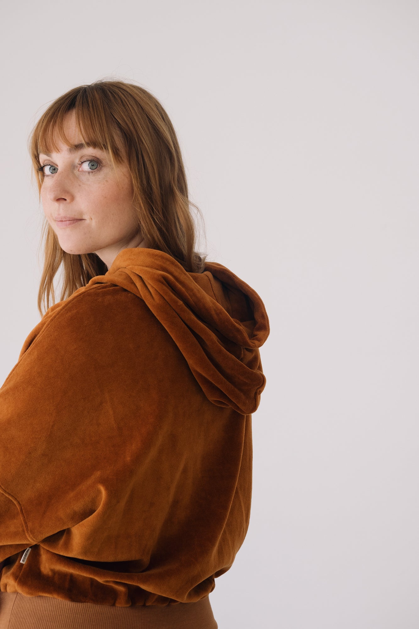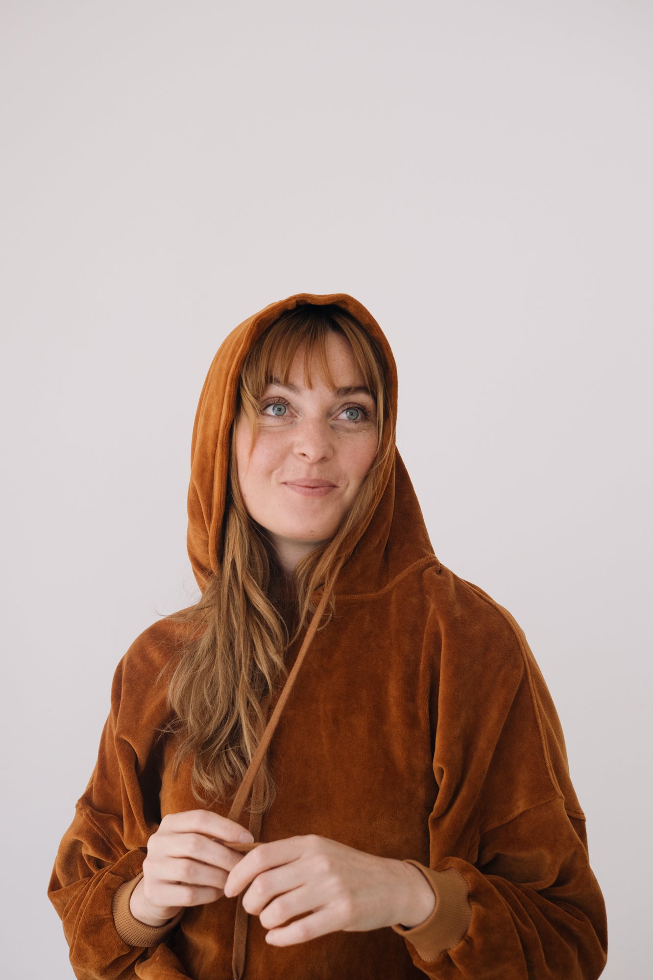 This Hoodie is a cozy sweatshirt full of personality. Perfect for those days when you’re looking for comfort—whether to relax, work out, or head out in style without compromising ease. This velour hoodie features a relaxed fit, dropped shoulders, and a roomy hood. Pair it with our Thais joggers for the perfect matching set! Respectful of your skin and the planet, it’s crafted from GOTS-certified organic cotton velour—a soft, warm, and slightly stretchy fabric that makes it ideal for the colder months. This terracotta shade conveys warmth, strength, and an earthy connection. A timeless and versatile color that adds depth and natural elegance to any outfit.