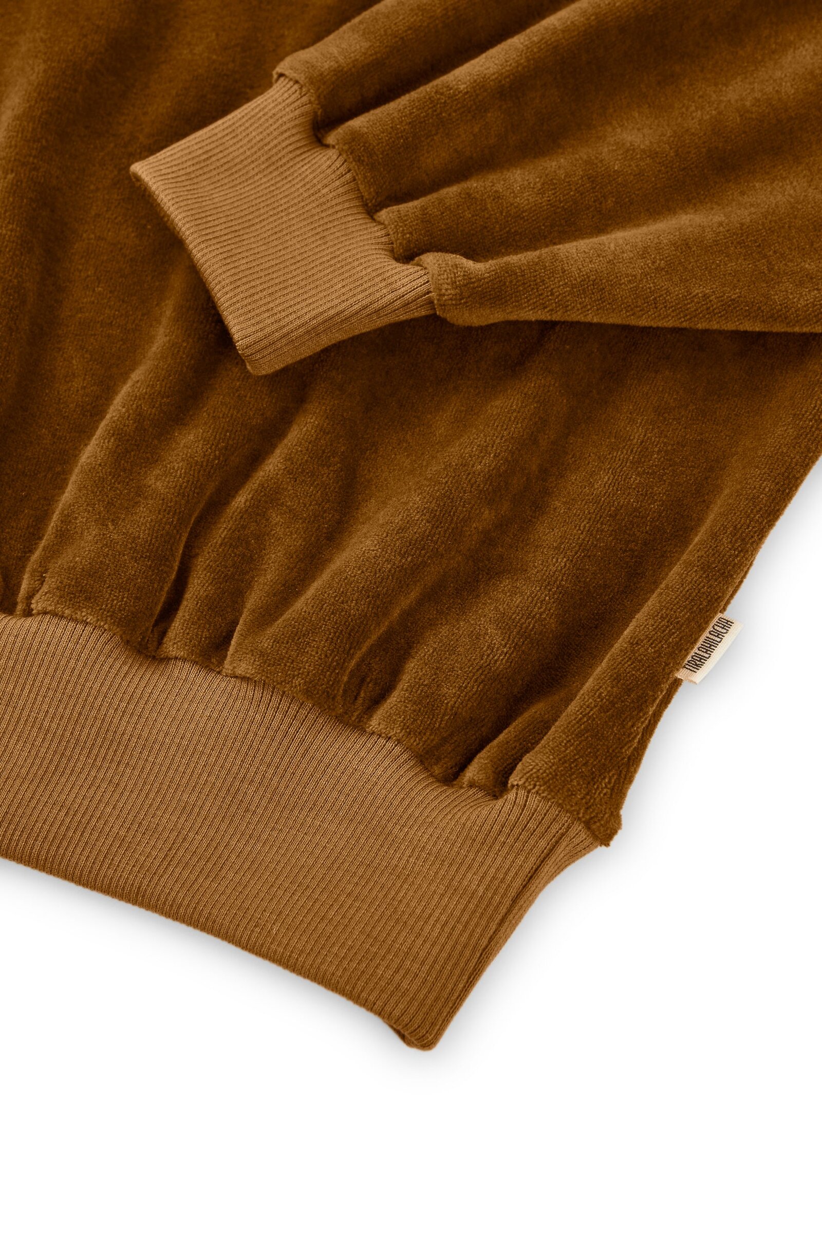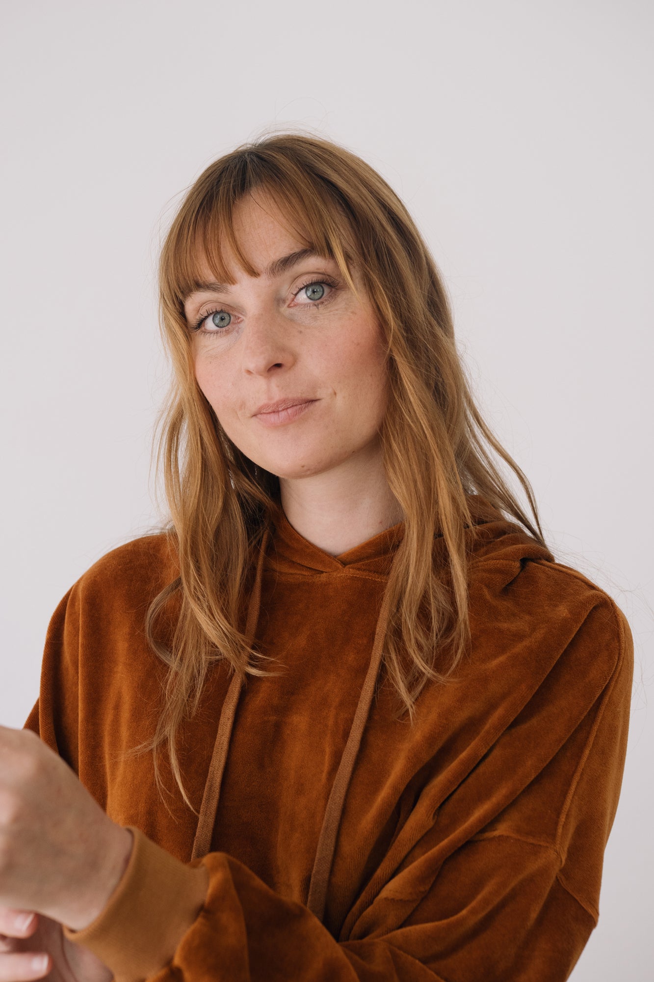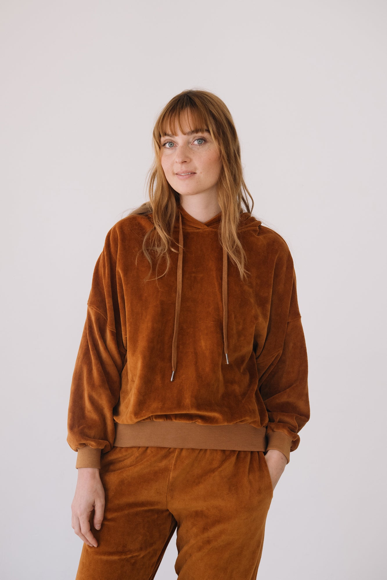 This Hoodie is a cozy sweatshirt full of personality. Perfect for those days when you’re looking for comfort—whether to relax, work out, or head out in style without compromising ease. This velour hoodie features a relaxed fit, dropped shoulders, and a roomy hood. Pair it with our Thais joggers for the perfect matching set! Respectful of your skin and the planet, it’s crafted from GOTS-certified organic cotton velour—a soft, warm, and slightly stretchy fabric that makes it ideal for the colder months. This terracotta shade conveys warmth, strength, and an earthy connection. A timeless and versatile color that adds depth and natural elegance to any outfit.