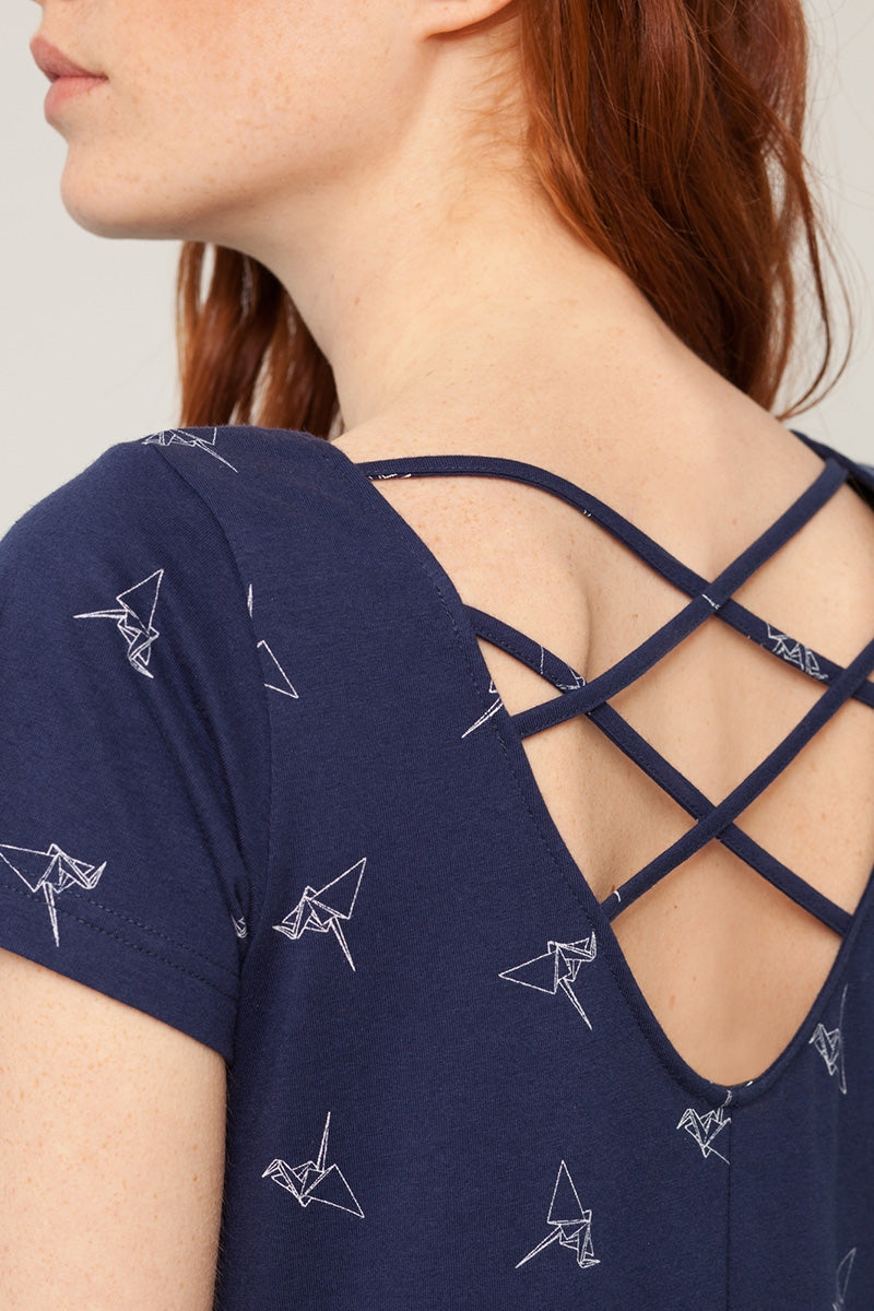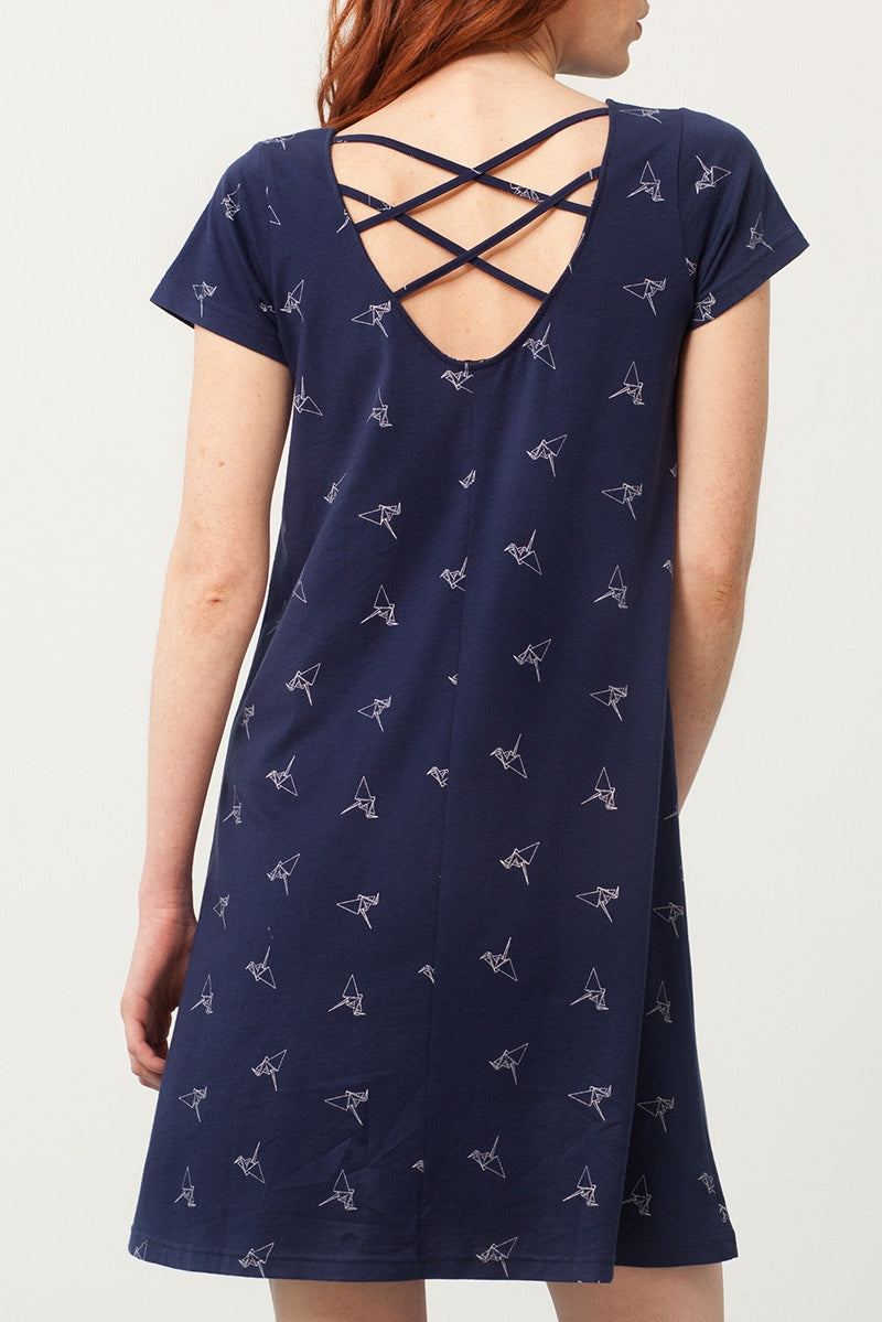 Flared dress with cross back neckline and short sleeve in navy blue and dragonflies print. Ecological women’s clothing made of fair trade organic cotton and water dyes with low environmental impact.