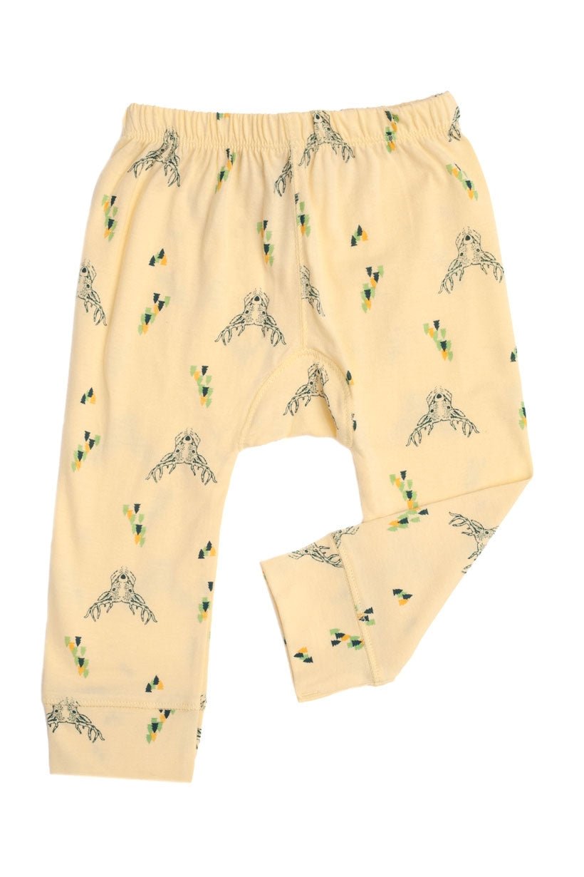 Pantalón bebe amarillo con estampado de ciervos. 100% algodón orgánico de Comercio Justo Certificado.