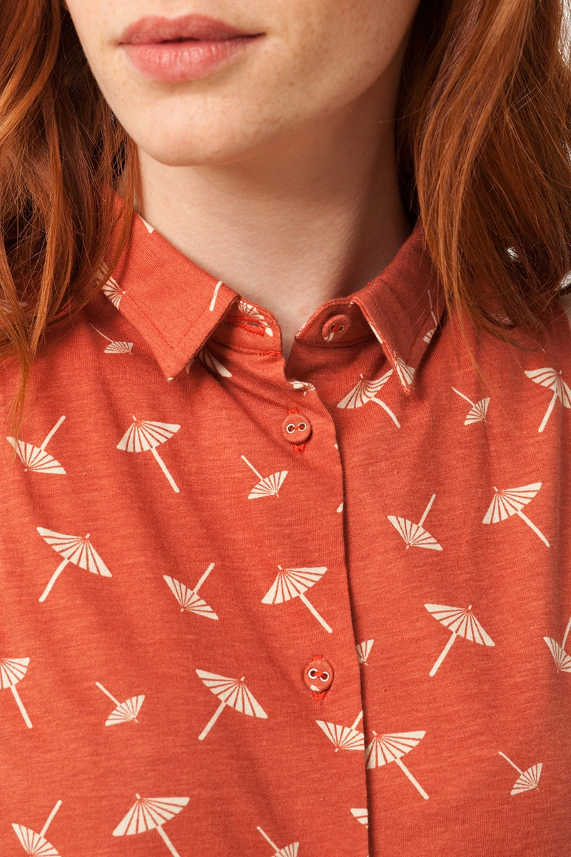 Flared blouse with shirt collar and covered buttons in terracota and umbrella print. Ecological women’s clothing made of fair trade organic cotton and water dyes with low environmental impact.
