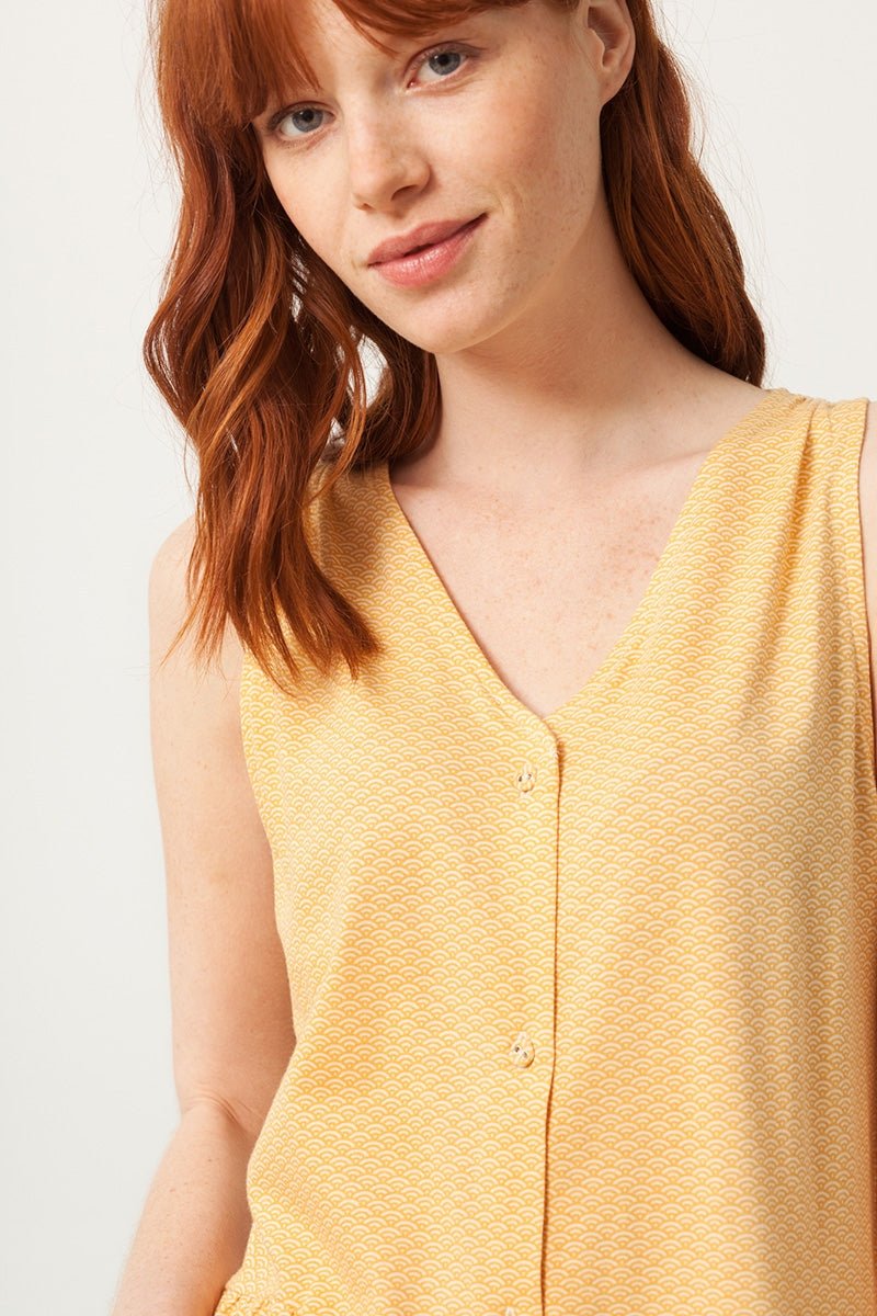 Oversized v-neck dress with covered buttons in honey yellow and japanese fan print. Ecological women’s clothing made of fair trade organic cotton and water dyes with low environmental impact. 100%…