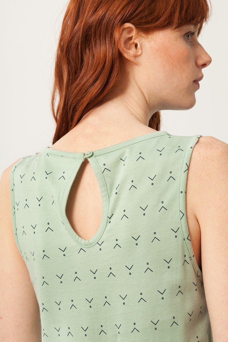Charleston sleeve less dress with placket and coverd buttons in mint green and abstract print. Ecological women’s clothing made of fair trade organic cotton and water dyes with low environmental impact.