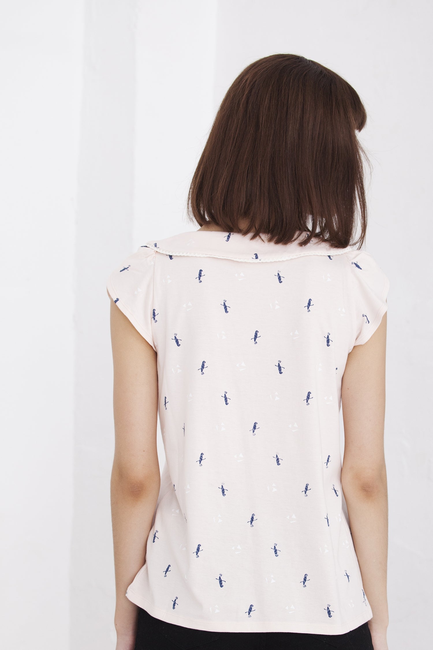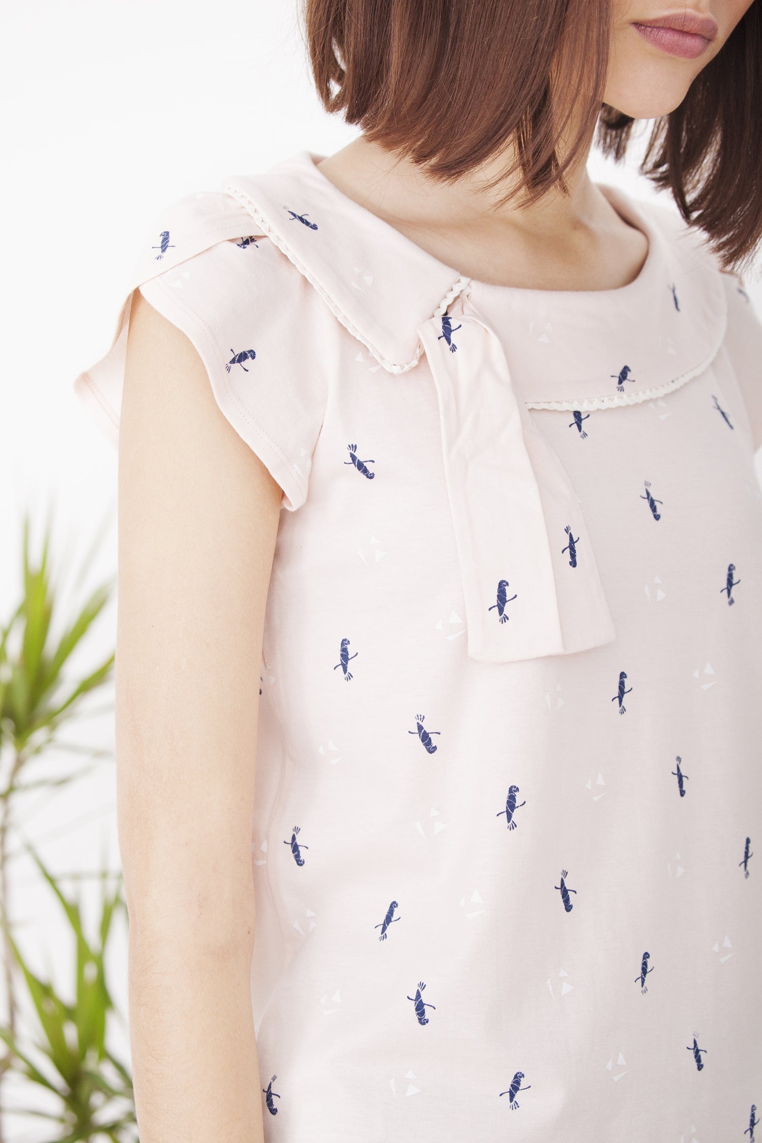 Light pink t-shirt with parrots and triangle print. Off- shoulder neck with a small lace. 100% Organic Fairtrade Certified Cotton.