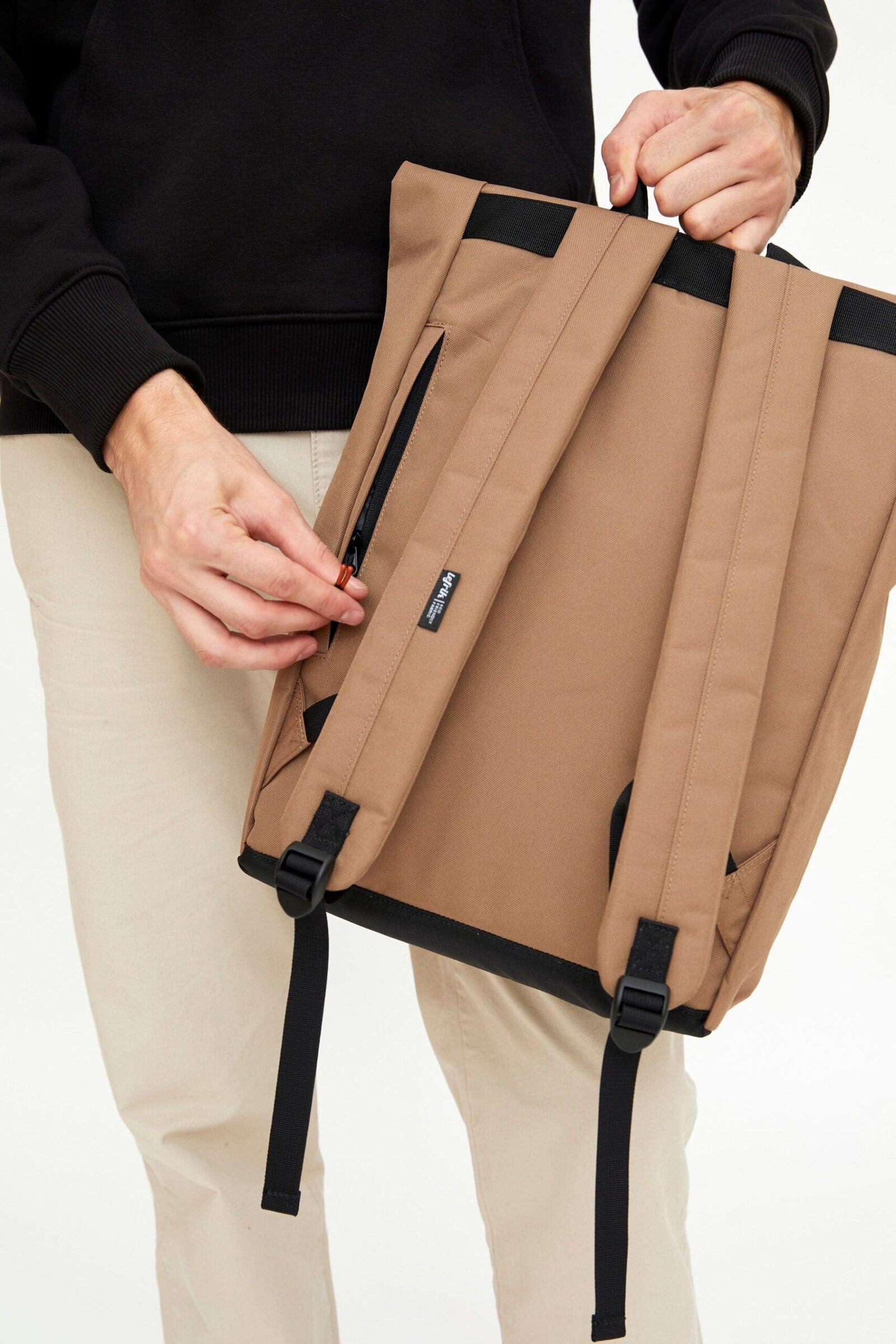 Our rolled backpack version, with two positions thanks to its roll-up closure system. Its strong magnets and top zip closure provide great security. It has a large interior compartment divided into a padded sleeve for computers up to 15.6″* and various pockets and organisers for smaller items. One back security pocket and adjustable padded handles.