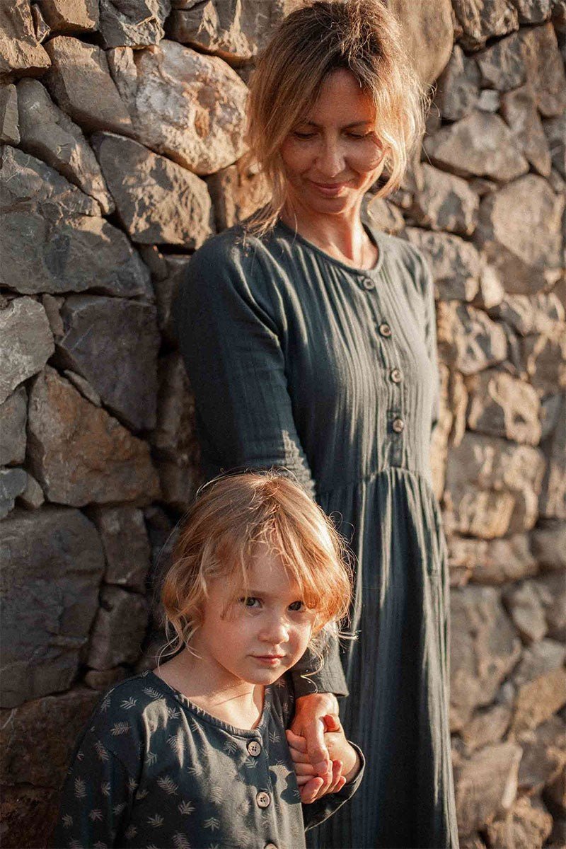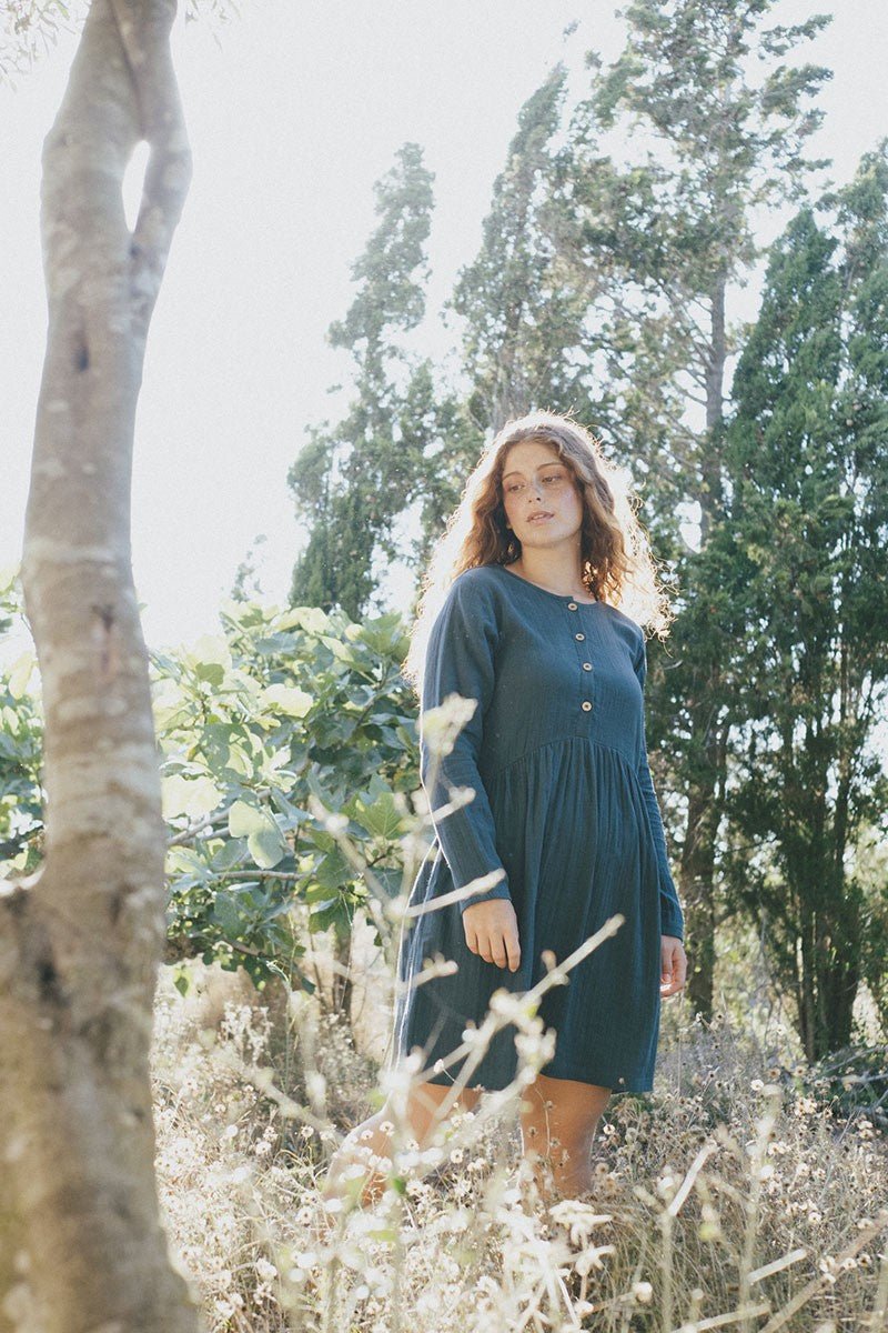 Sahar is a short dress cut above the waist. It has coconut buttons at the top and useful pockets on the sides. It is an elegant model that adapts perfectly to a woman’s body. A timeless basic in blue made by soft muslin fabric. You be also wear it during pregnancy and allows comfortable breastfeeding. 180 gr.