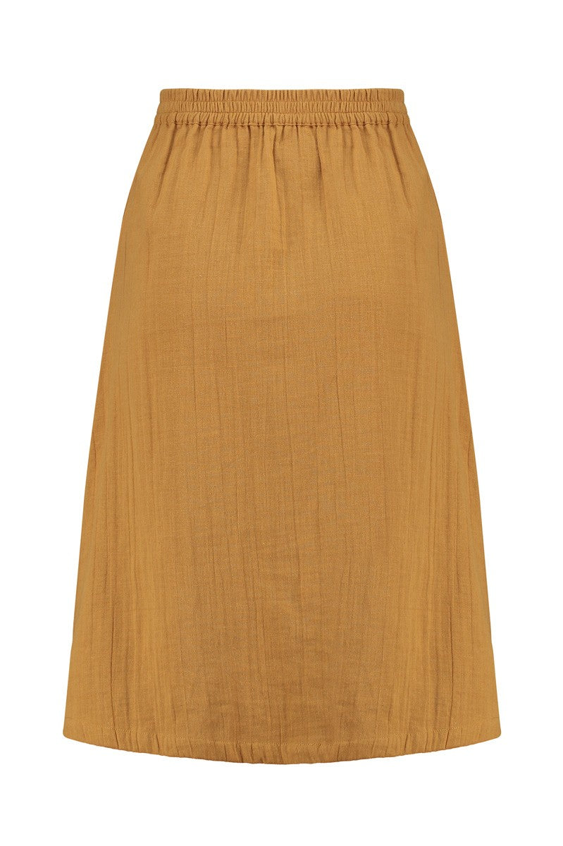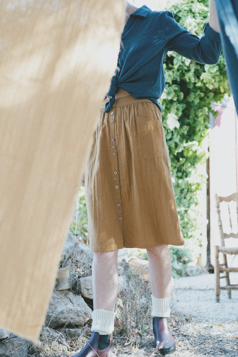 Samara is an evasé skirt with plaston pockets and cute coconut buttons. It has an elastic waistband at the back for a better fit around your waist. It is made of muslin fabric in mustard, soft and pleasant to the touch. It is a timeless basic that you can combine with an infinite number of garments.
