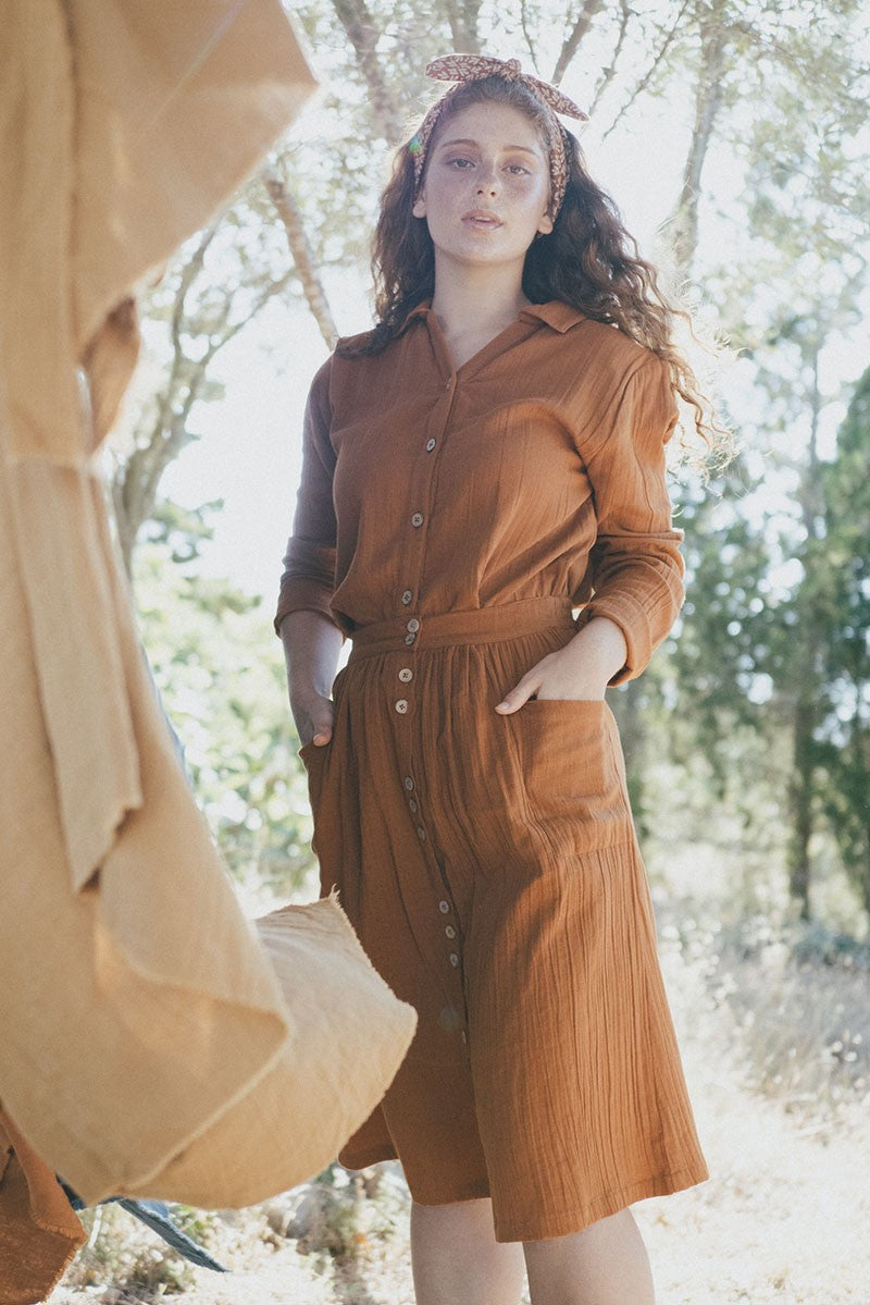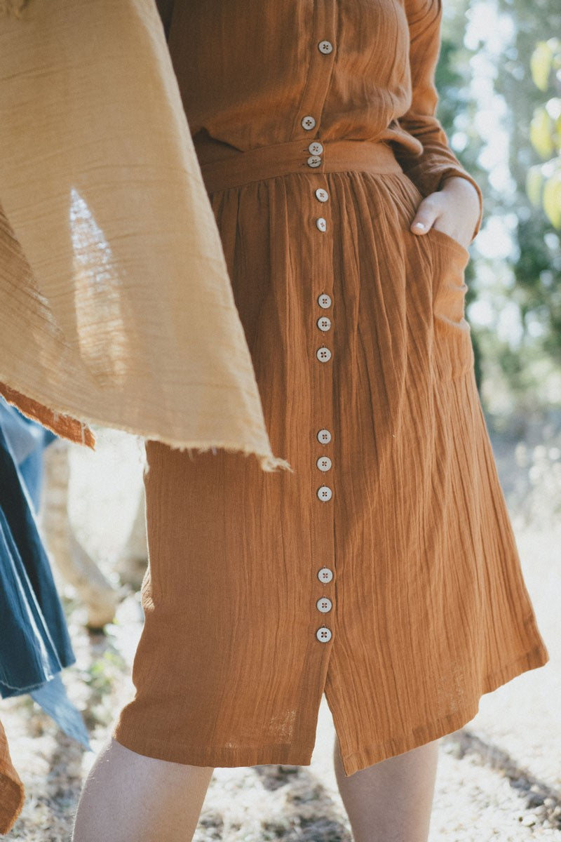 Samara is an evasé skirt with plaston pockets and cute coconut buttons. It has an elastic waistband at the back for a better fit around your waist. It is made of muslin fabric in terracotta, soft and pleasant to the touch. It is a timeless basic that you can combine with an infinite number of garments.