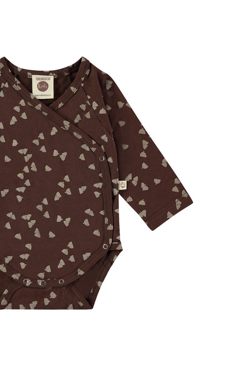 Long sleeves baby jumpsuit in brown with nickel-free clasps. Its acorn print is inspired by the most essential, our environment. Our home. HOME gives it a very special touch. All our garments are hypoallergenic and chemical free to take care of your child’s sensitive and delicate skin.