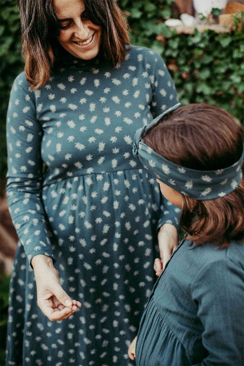 Saura is an oversize dress with a very warm turtleneck. It has side pockets and a cut that you can wear during pregnancy. In blue with fern leaves print inspired by the most essential, our environment. Our home, HOME, gives that special touch to the garment.