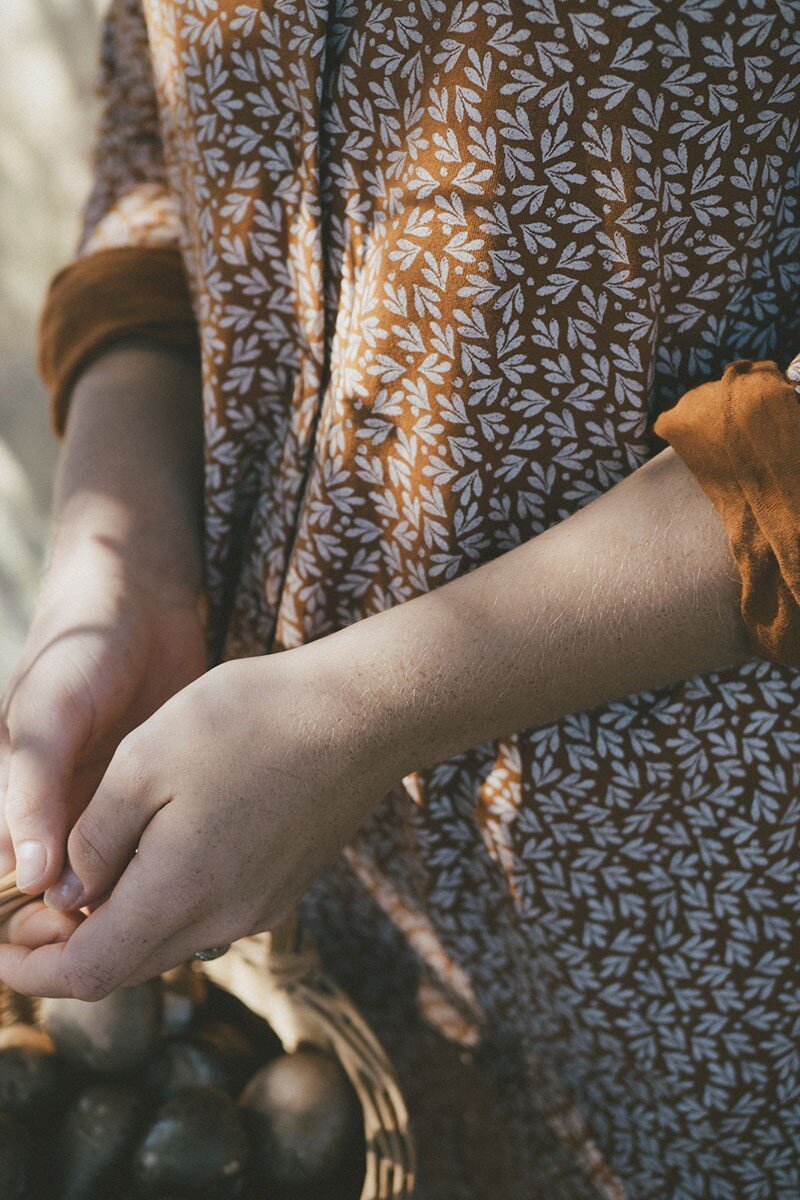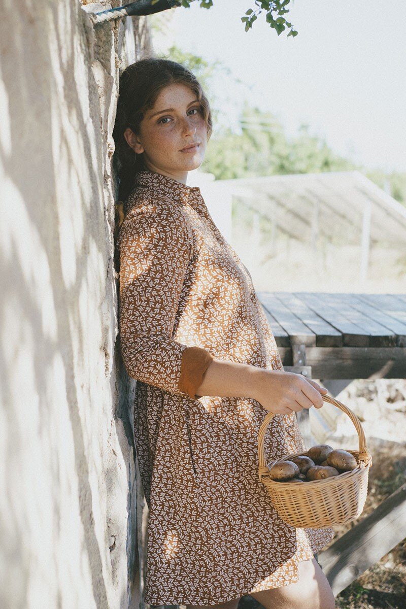 Scarlette is an oversized knit shirt dress. It has side pockets and a pleat that gives it an original touch. A versatile garment that you can wear if you are pregnant allowing you to breastfeed comfortably. In terracotta with olive leaves inspired by the most essential, our environment. Our home, HOME, gives that special touch to the garment.
